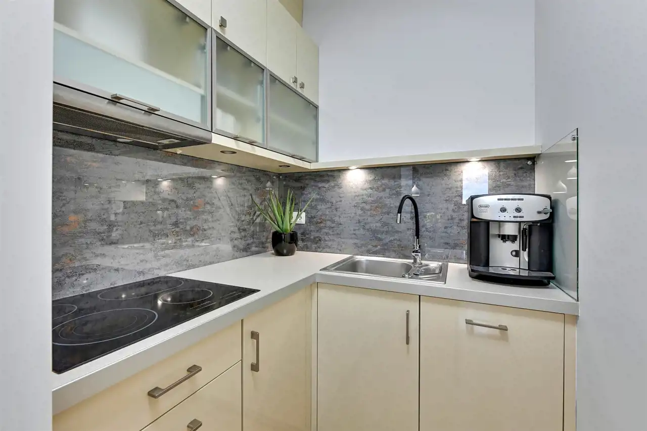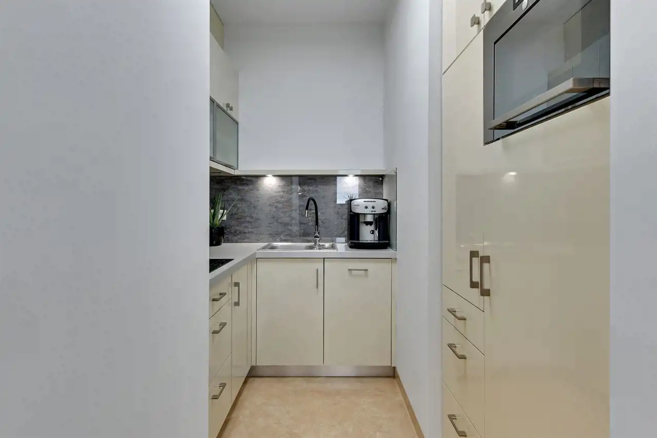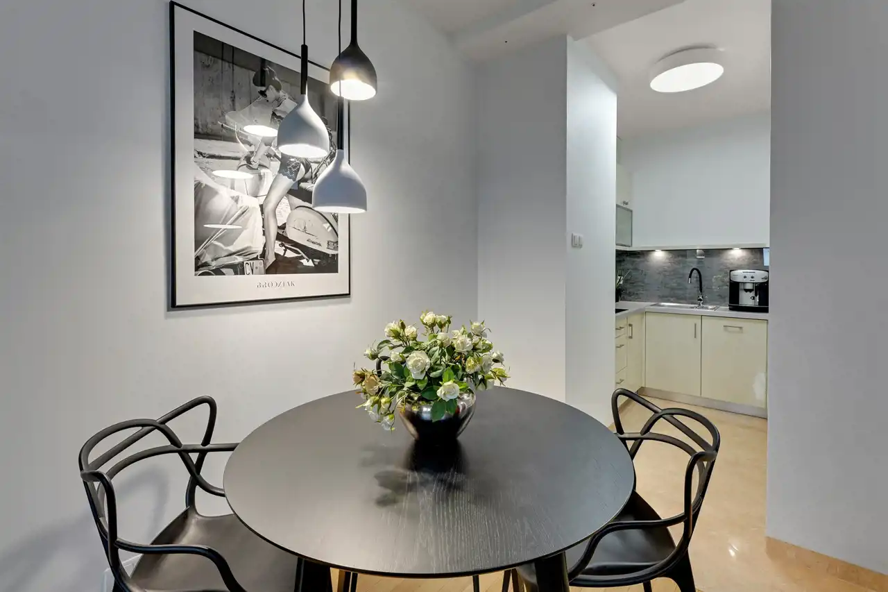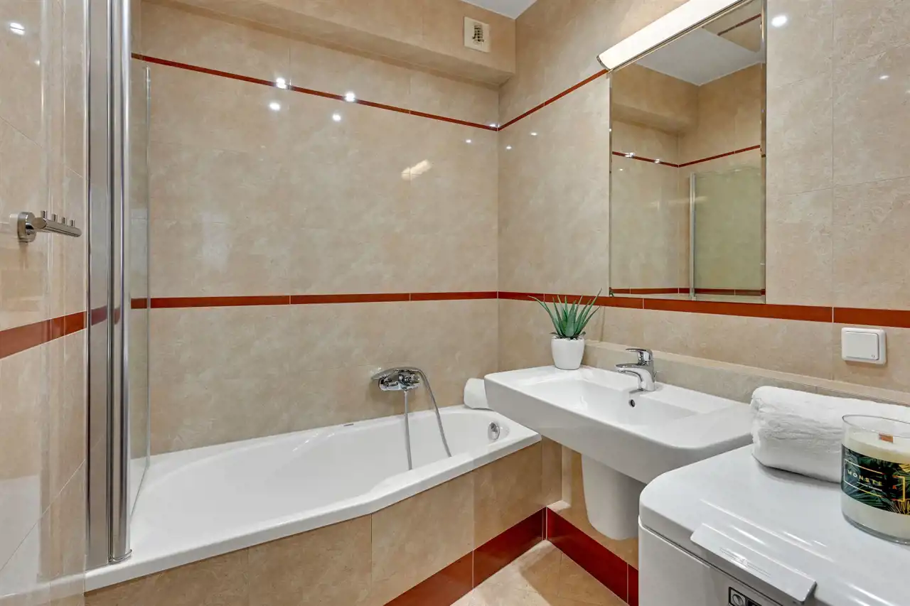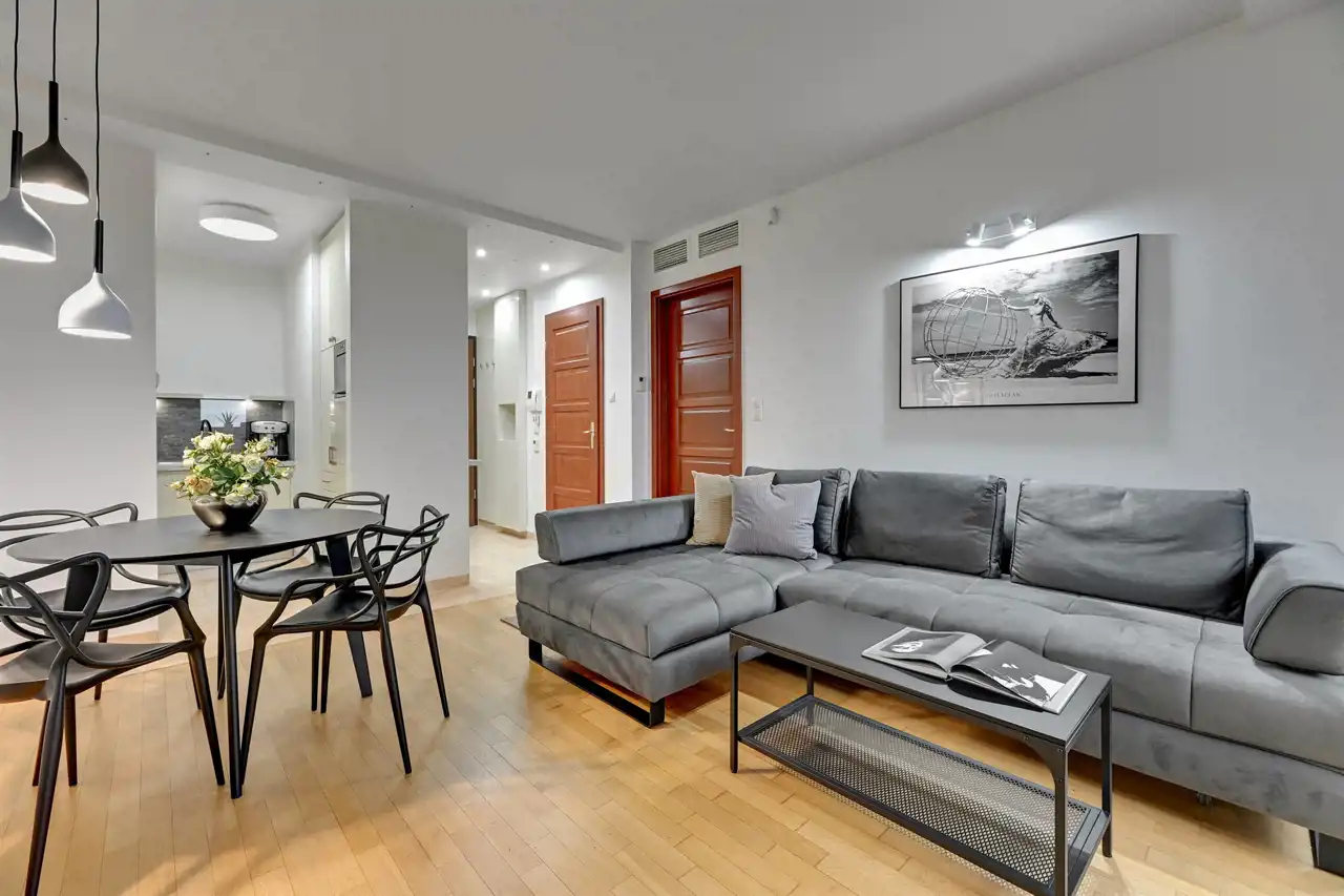 Dwupokojowy apartament zlokalizowany jest na drugim piętrze (VI kondygnacji) kultowego budynku Sea Towers. Nieruchomość składa się z salonu z aneksem kuchennym, sypialni, łazienki, toalety oraz przedpokoju. Z okien oraz przyległego do mieszkania balkonu rozpościera się wspaniały widok na błękit morza. Wyjścia na relaksujący balkon znajdują się zarówno w sypialni jak i w pokoju dziennym. Apartament jest odnowiony, w pełni wyposażony w niezbędny sprzęt i meble. Salon oferuje miejsce do odpoczynku z rogową sofą i dużym telewizorem, jak i część jadalnianą wyposażoną w okrągły stół i cztery krzesła w komplecie. Aneks kuchenny, nieco oddzielony od pokoju dziennego, zapewnia wygodne miejsce przygotowywania posiłków. Sypialnia jest kolorystycznym smaczkiem, wyrywając się przed stonowane barwy wnętrza. Oferuje duże, małżeńskie łóżko z miękkim zagłówkiem, szafę oraz telewizor. Łazienka w ponadczasowych beżach wyposażona jest w wannę i pralkę. Apartament jest przytulny, modny i funkcjonalny, idealny dla nowoczesnego singla lub pary, poszukującego lokum w doskonałej lokalizacji Trójmiasta.
