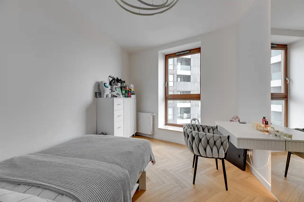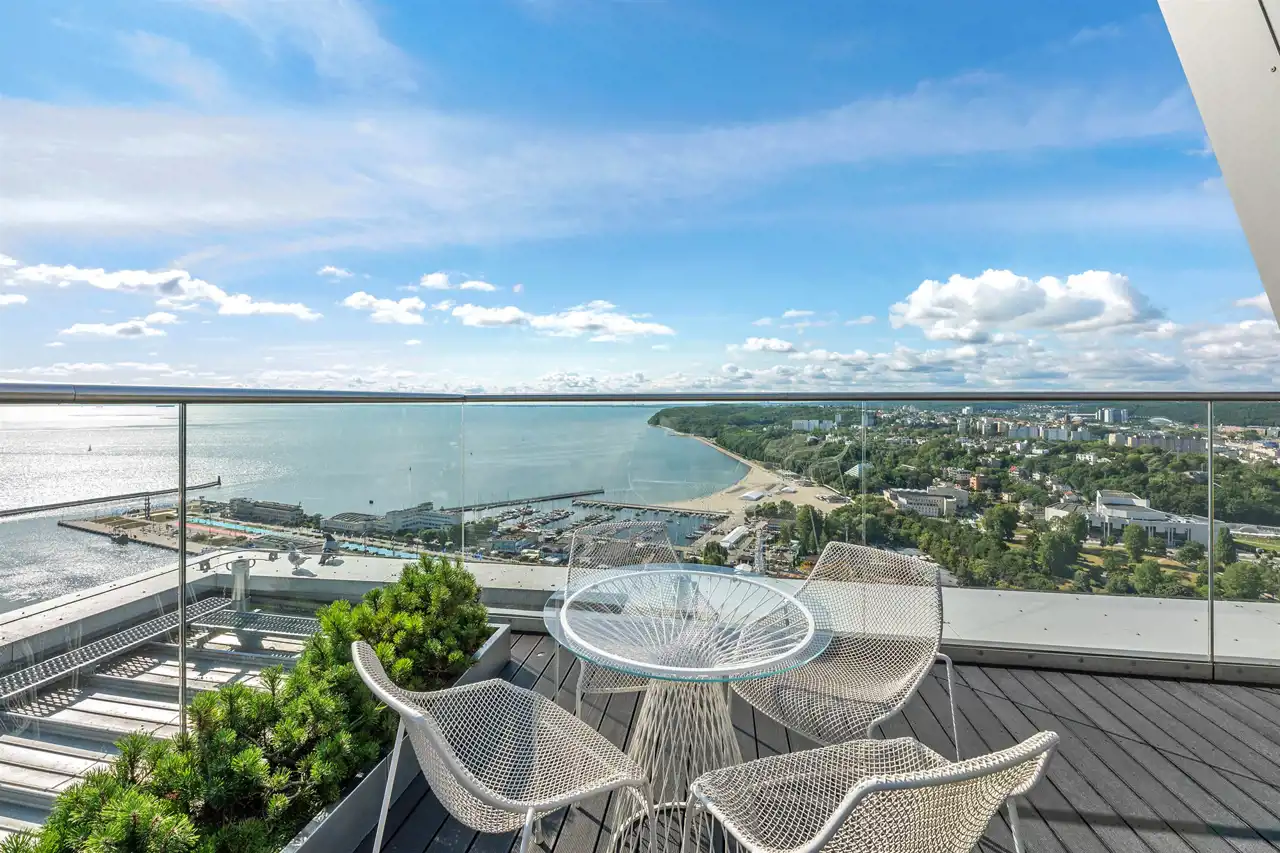 Trzypokojowy apartament usytuowany na 10 piętrze (XIV kondygnacja) budynku. Na powierzchnię 82,6 m2 składa się przestronny salon połączony z aneksem kuchennym, dwie sypialnie, dwie łazienki oraz pralnia z dużą garderobą. Z salonu można wyjść na balkon, z którego rozpościera się przepiękny widok na zatokę i morski krajobraz. Aneks kuchenny kompleksowo wyposażony w sprzęt AGD najwyższej jakości (lodówka Miele, piekarnik Siemens, mikrofalówka Siemens, okap, płyta). Jedną z łazienek wyposażono w kabinę prysznicową, natomiast drugą w wannę. W większej sypialni duże małżeńskie łoże oraz pojemna szafa garderobianą. W mniejszej sypialni znajduje się rozkładana sofa, biurko oraz komoda. Apartament w nowoczesnym stylu, idealne miejsce do zamieszkania lub pod inwestycję.