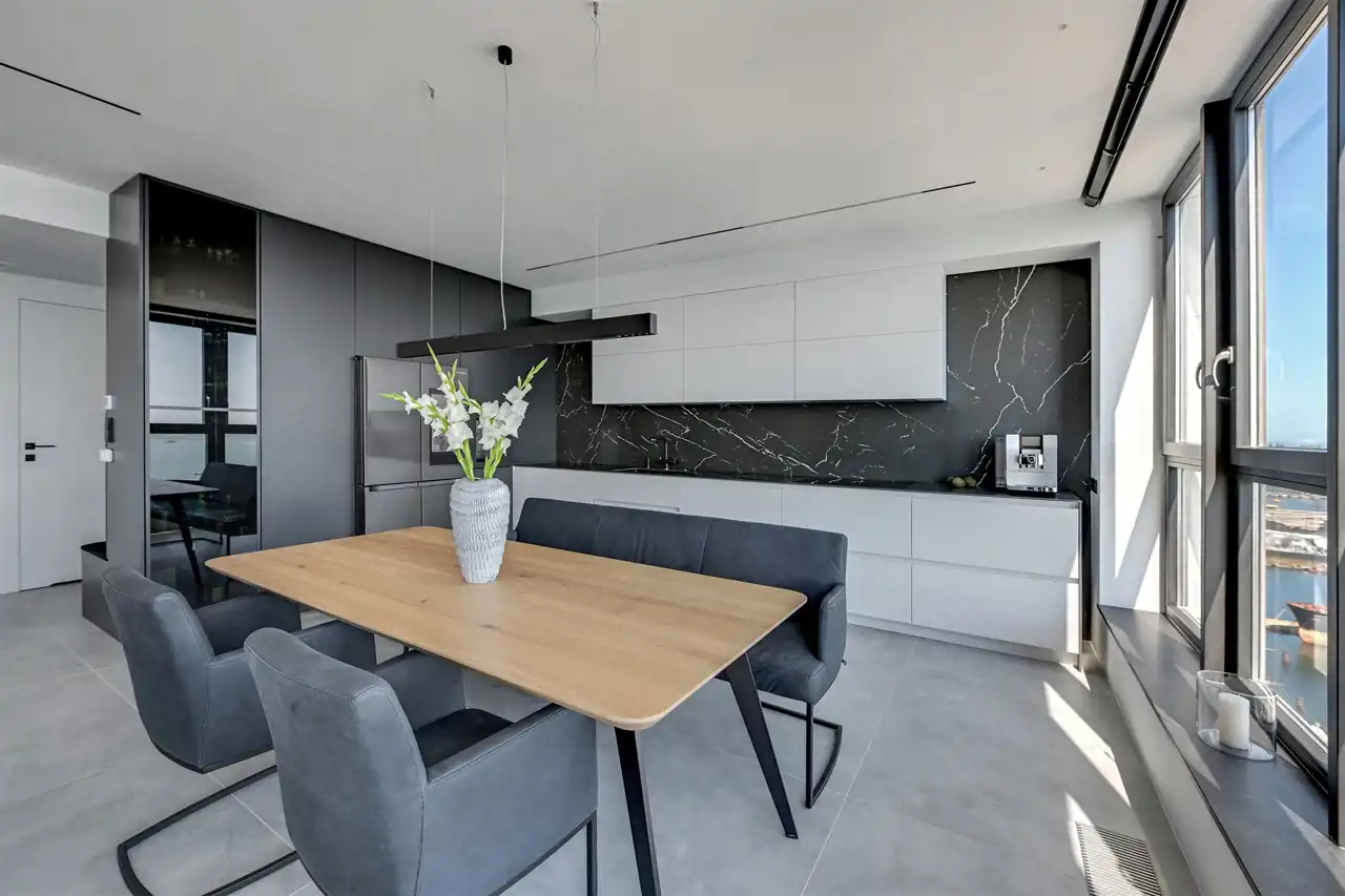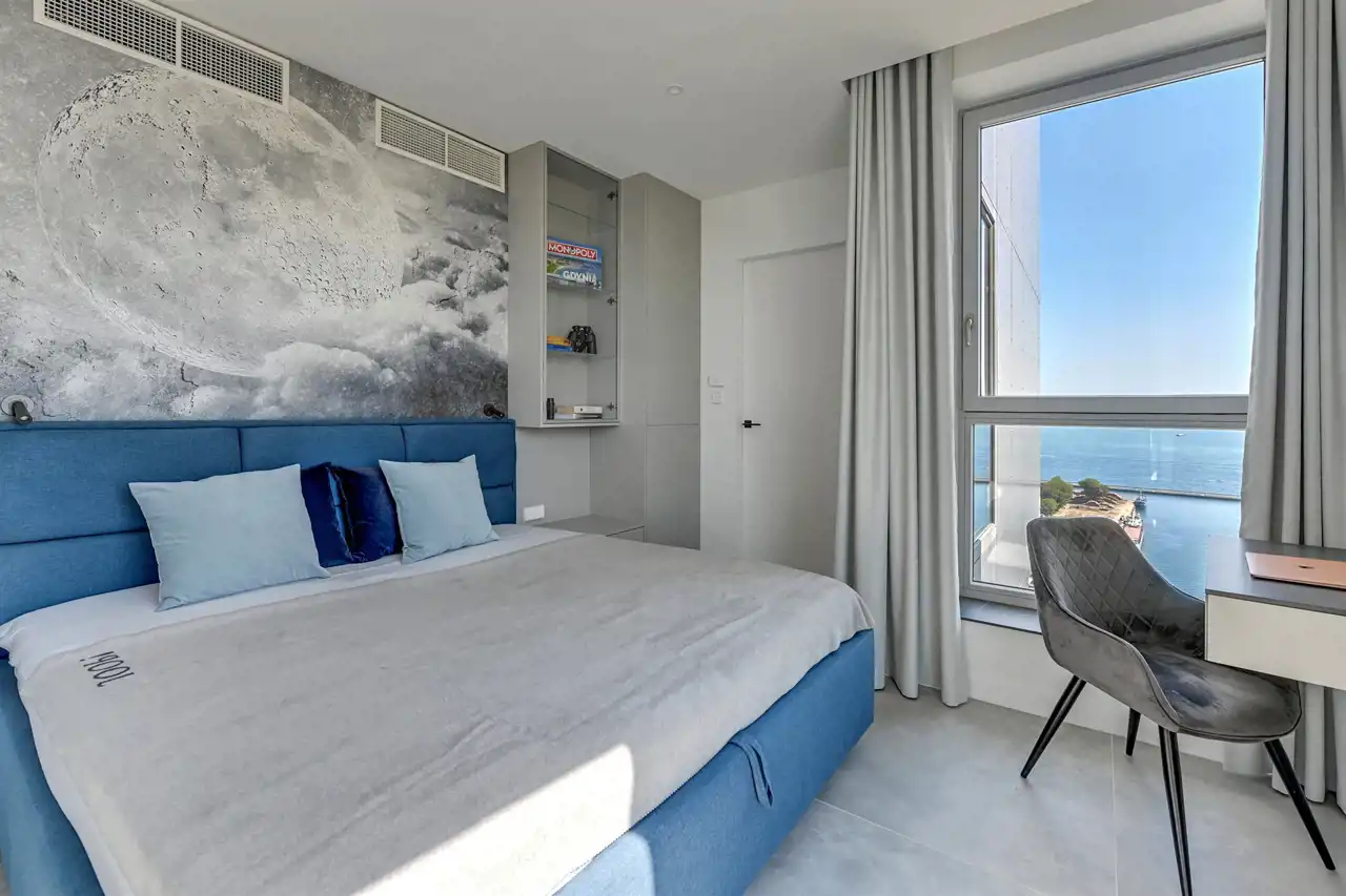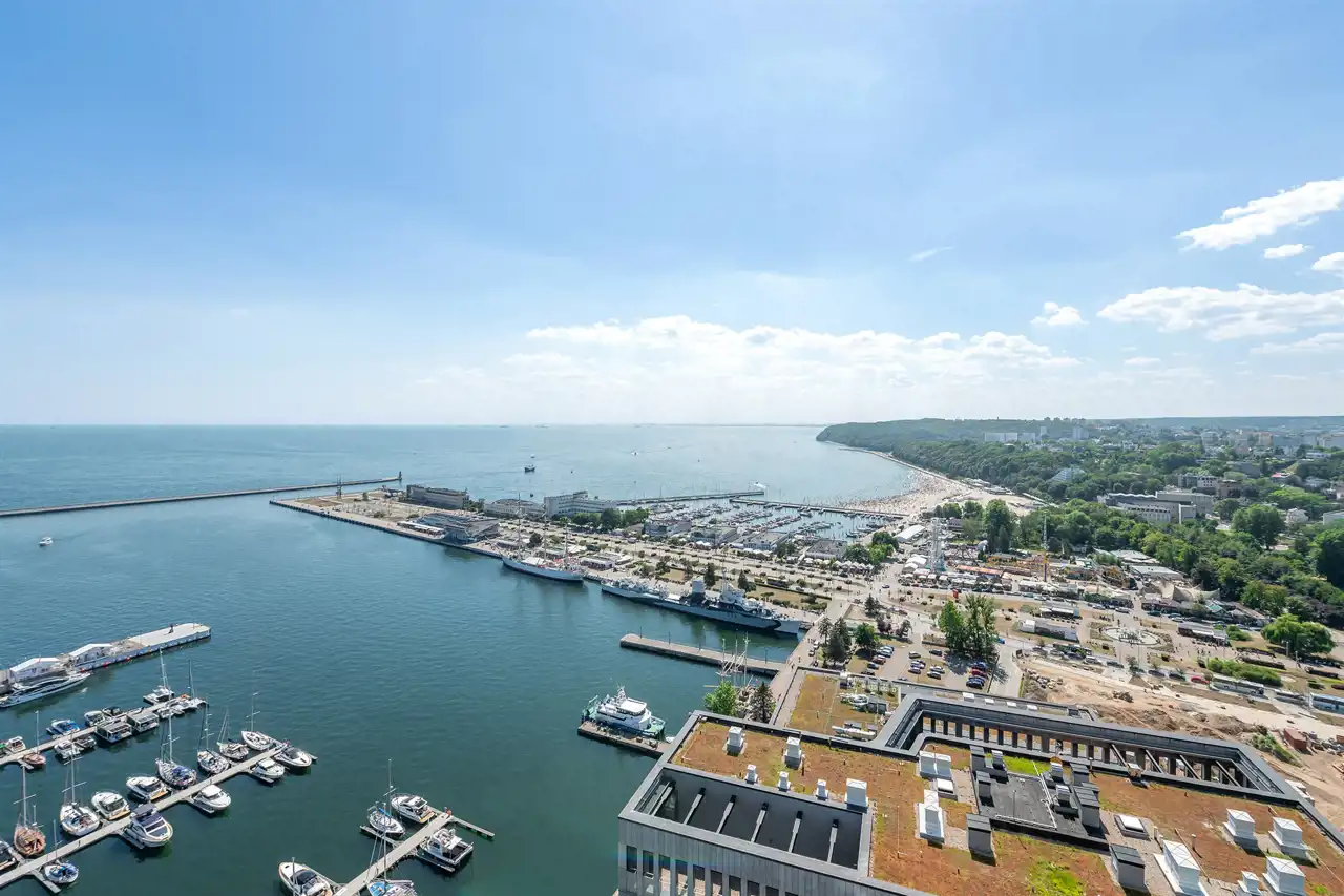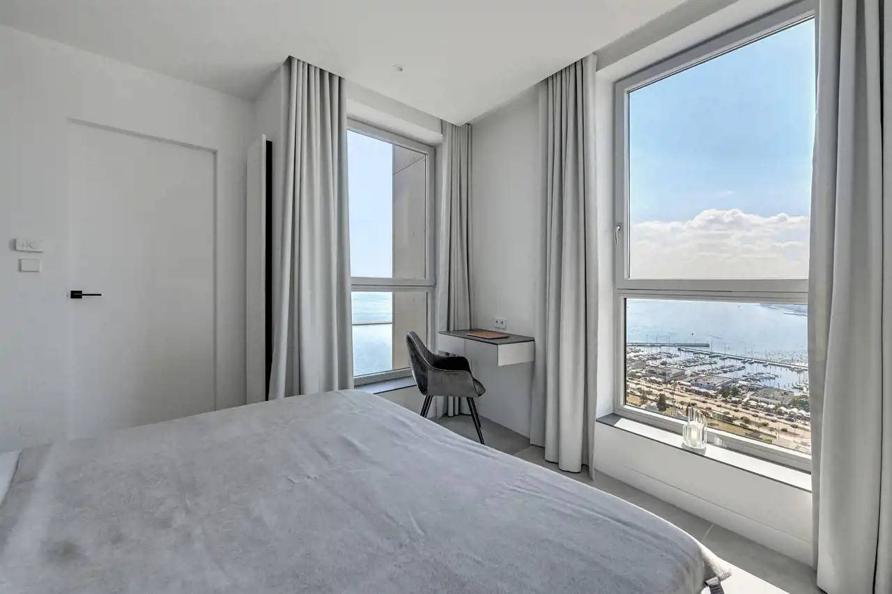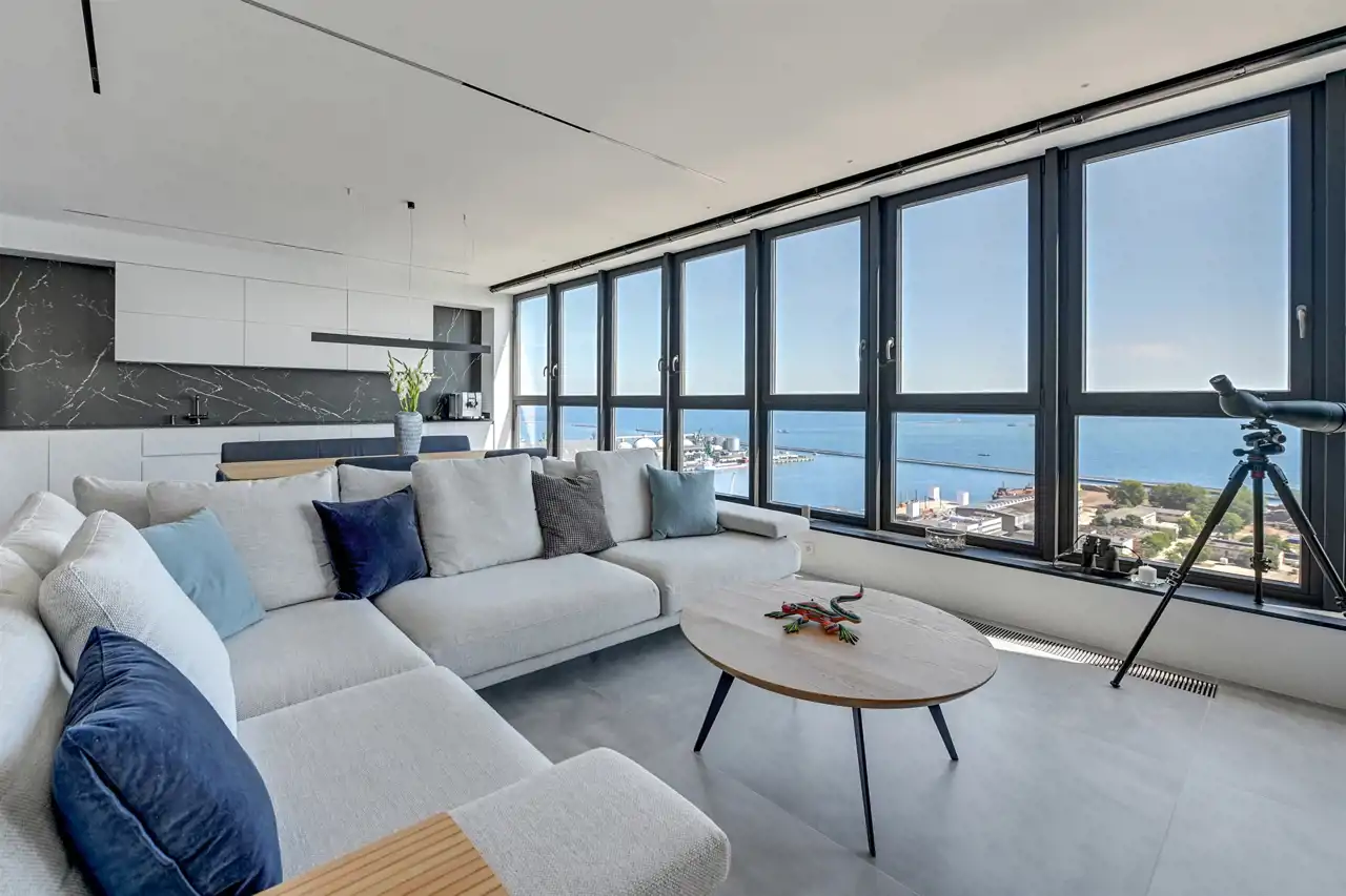 Apartament znajduje się na 23 piętrze (XXVII kondygnacji), a swoją powierzchnią 81,20 m2 obejmuje: salon z aneksem kuchennym, sypialnię, łazienkę, toaletę i przedpokój. Zniewalający widok na zatokę, rozpościerający się za wysokimi oknami apartamentu, to tylko jedna z jego niepodważalnych zalet. Panorama rozciągająca się niemal na całą długość zewnętrznej ściany doświetla nowocześnie urządzone wnętrze salonu. Skąpane w stonowanych szarościach, bieli i drewnie prezentuje ponadczasową elegancję i klasę. Część rekreacyjną dziennego pokoju wyposażono w dużą, rogową sofę z telewizorem w komplecie, zaś część jadalnianą w długi, wygodny stół oraz ławę. Elementy ozdobnego kamienia koją oczy podczas wypoczynku, podobnie jak subtelna morska bryza. Aneks kuchenny oferuje mnogość miejsca do przechowywania, dwuskrzydłową lodówkę i obszerny blat roboczy. Sypialnia to przestronne pomieszczenie ze wspaniałym widokiem na Bałtyk i miejską plażę. Wyposażoną ją w łóżko king size oraz praktyczne biurko. Luksusowo wykończoną łazienkę stanowi kabina prysznicowa typu walk-in, umywalka z szafką i toaleta. W mniejszej toalecie dla gości zapewniono miskę ustępową i toaletę. Apartament o wyszukanym stylu zaspokoi oczekiwania nawet najbardziej wymagających osób.