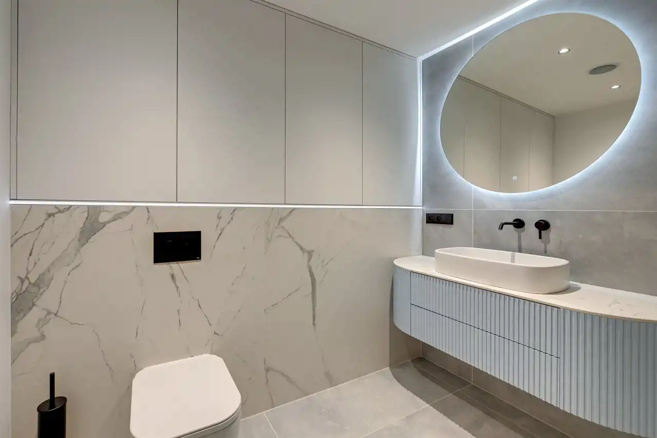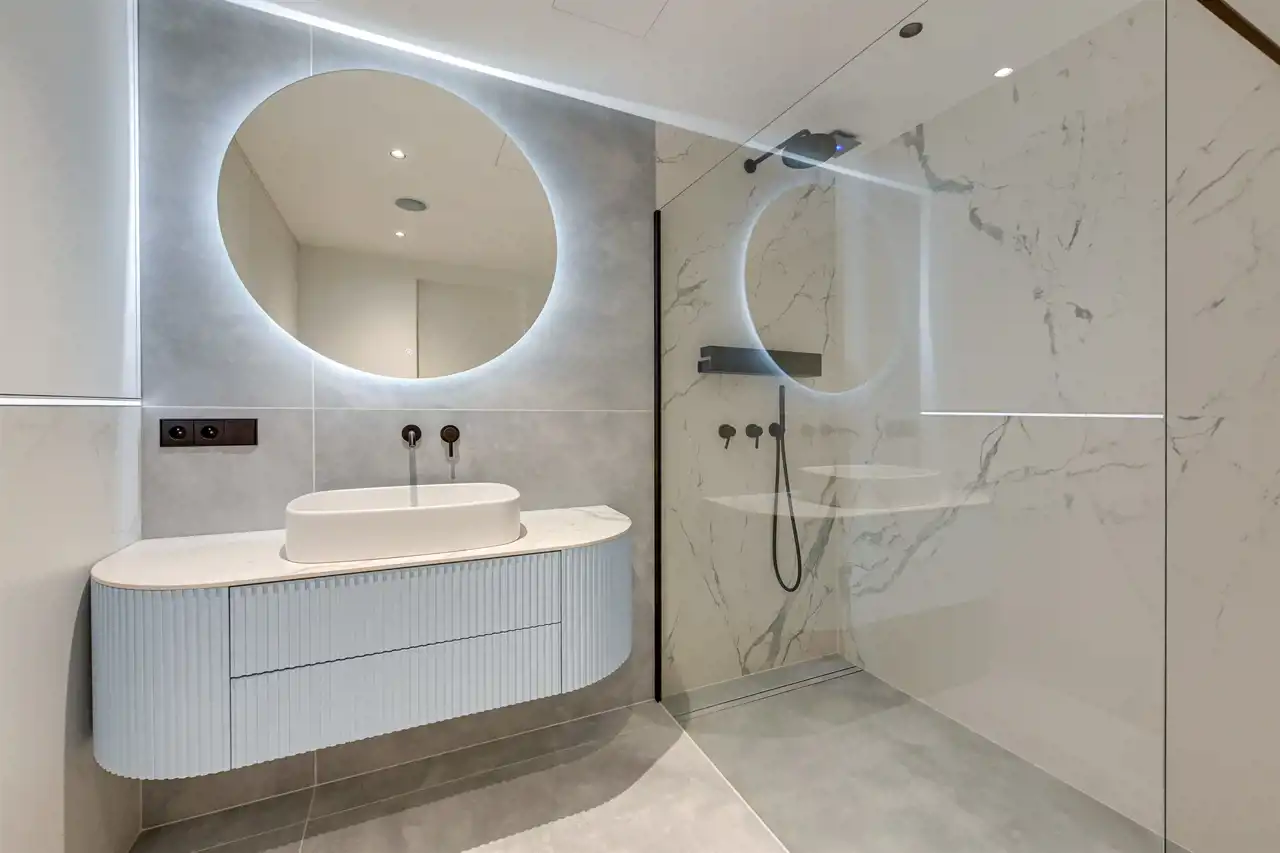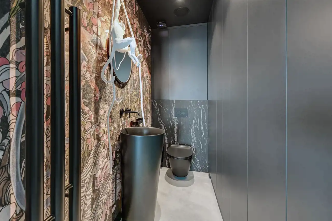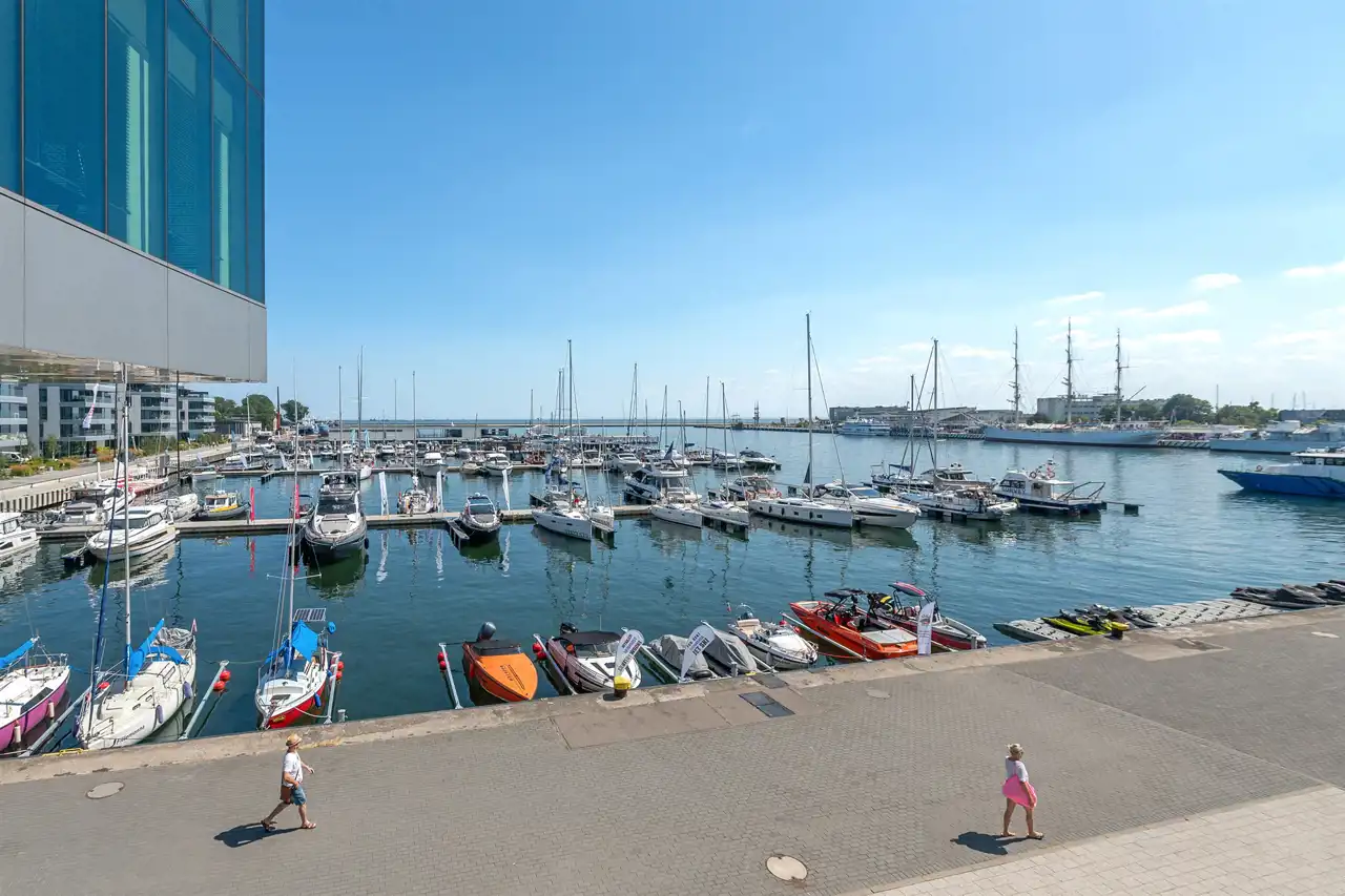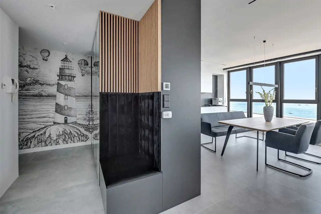Apartament znajduje się na 23 piętrze (XXVII kondygnacji), a swoją powierzchnią 81,20 m2 obejmuje: salon z aneksem kuchennym, sypialnię, łazienkę, toaletę i przedpokój. Zniewalający widok na zatokę, rozpościerający się za wysokimi oknami apartamentu, to tylko jedna z jego niepodważalnych zalet. Panorama rozciągająca się niemal na całą długość zewnętrznej ściany doświetla nowocześnie urządzone wnętrze salonu. Skąpane w stonowanych szarościach, bieli i drewnie prezentuje ponadczasową elegancję i klasę. Część rekreacyjną dziennego pokoju wyposażono w dużą, rogową sofę z telewizorem w komplecie, zaś część jadalnianą w długi, wygodny stół oraz ławę. Elementy ozdobnego kamienia koją oczy podczas wypoczynku, podobnie jak subtelna morska bryza. Aneks kuchenny oferuje mnogość miejsca do przechowywania, dwuskrzydłową lodówkę i obszerny blat roboczy. Sypialnia to przestronne pomieszczenie ze wspaniałym widokiem na Bałtyk i miejską plażę. Wyposażoną ją w łóżko king size oraz praktyczne biurko. Luksusowo wykończoną łazienkę stanowi kabina prysznicowa typu walk-in, umywalka z szafką i toaleta. W mniejszej toalecie dla gości zapewniono miskę ustępową i toaletę. Apartament o wyszukanym stylu zaspokoi oczekiwania nawet najbardziej wymagających osób.