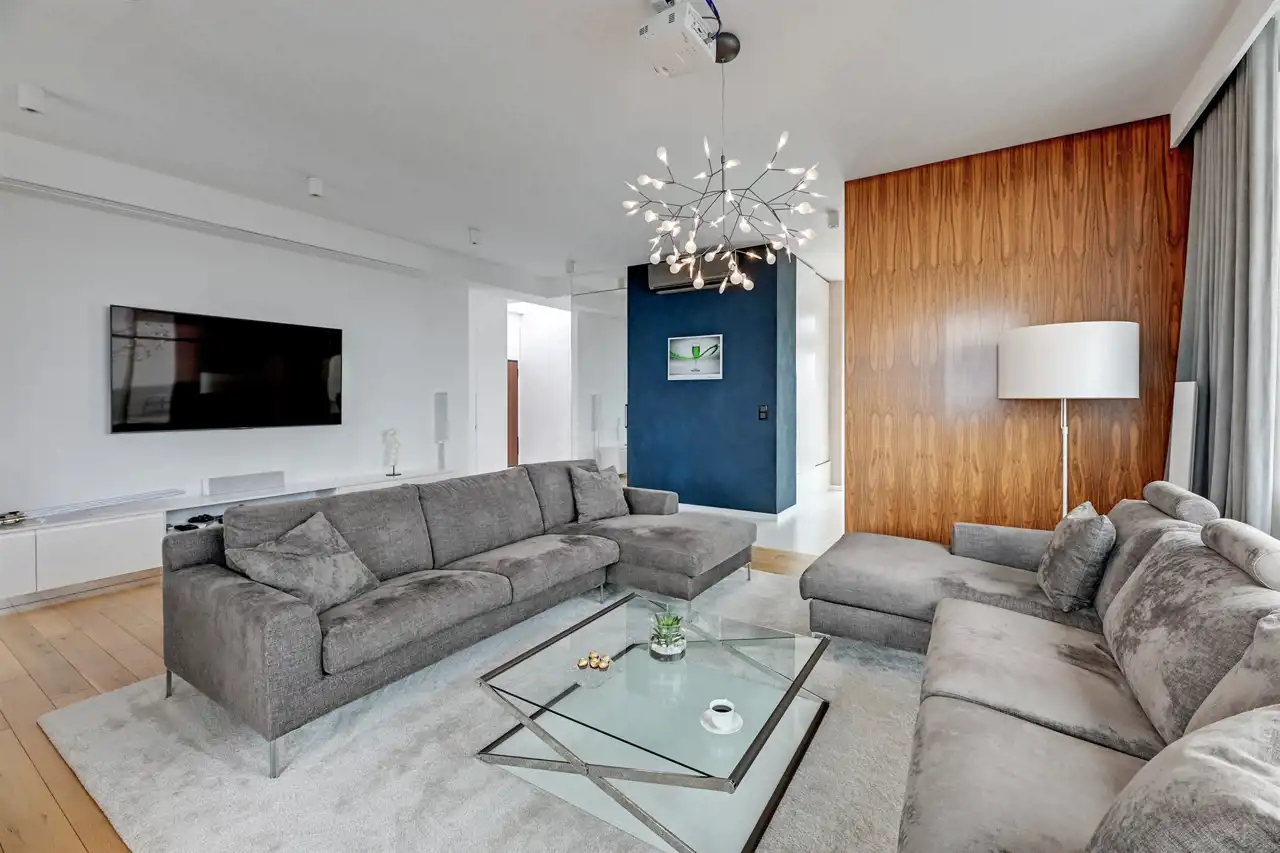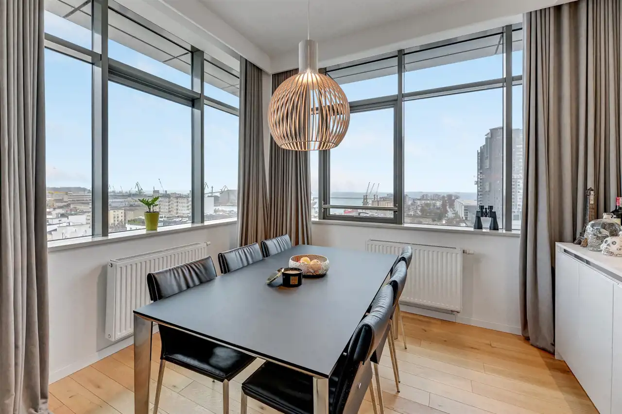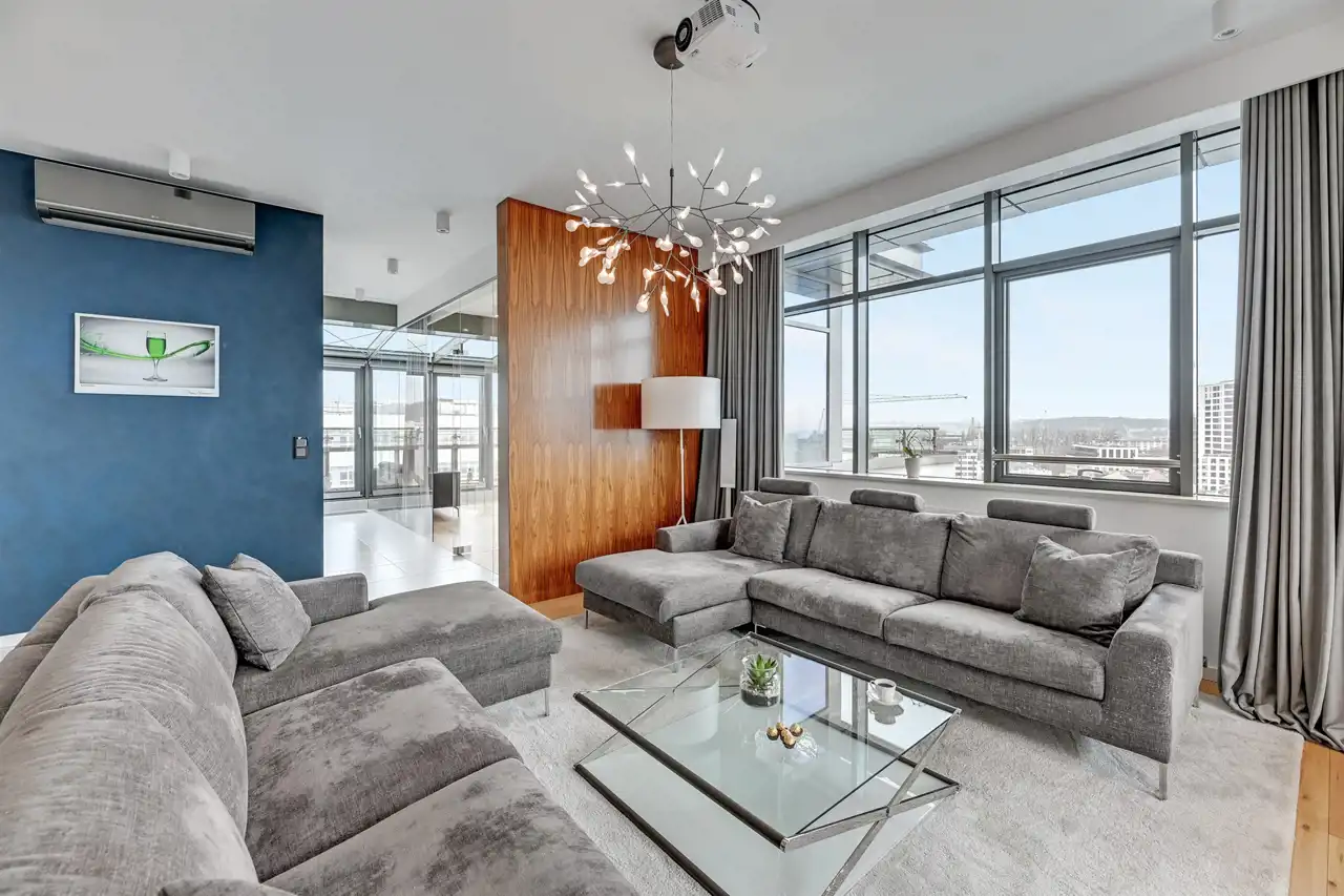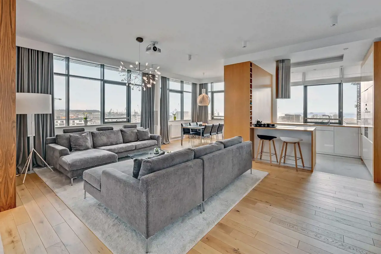 Apartament o powierzchni 157,75 m2 zlokalizowany jest na ostatnim, jedenastym piętrze budynku, a na jego powierzchnię składa się salon z aneksem kuchennym, sypialnia, gabinet, łazienka, toaleta i przedpokój. Zachwycający penthouse, z którego nieskrępowanie rozciąga się panoramiczny widok na tętniący życiem krajobraz Gdyni, a okalający cały apartament taras tylko potęguje te wrażenia. Ogromny salon wyposażony w stylowe, popielate kanapy jest sercem mieszkania, z którego dostaniemy się do wszystkich pozostałych pomieszczeń. Bezpośrednio do pokoju dziennego przylega aneks kuchenny z funkcjonalną wyspą i pojemną zabudową meblową, a także pełnym wyposażeniem AGD od renomowanych producentów. Strefa jadalniana oferuje rozkładany stół z sześcioma krzesłami w komplecie. Przestronną sypialnię stanowi wygodne, małżeńskie łóżko, telewizor i niezmiennie zachwycający widok. Duża łazienka z wanną pozwala na odrobinę relaksu, a toaleta dla gości zapewnia intymność domowników. W nieruchomości zainstalowano klimatyzację oraz nagłośnienie. Doskonała propozycja dla osób poszukujących wyjątkowej nieruchomości w wyjątkowej lokalizacji.
