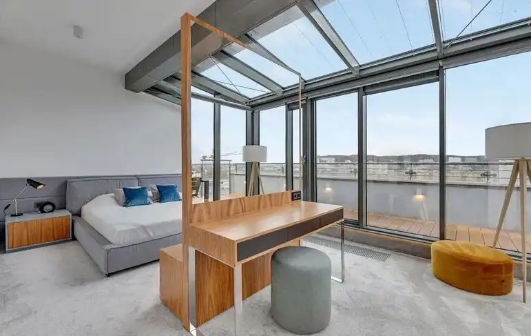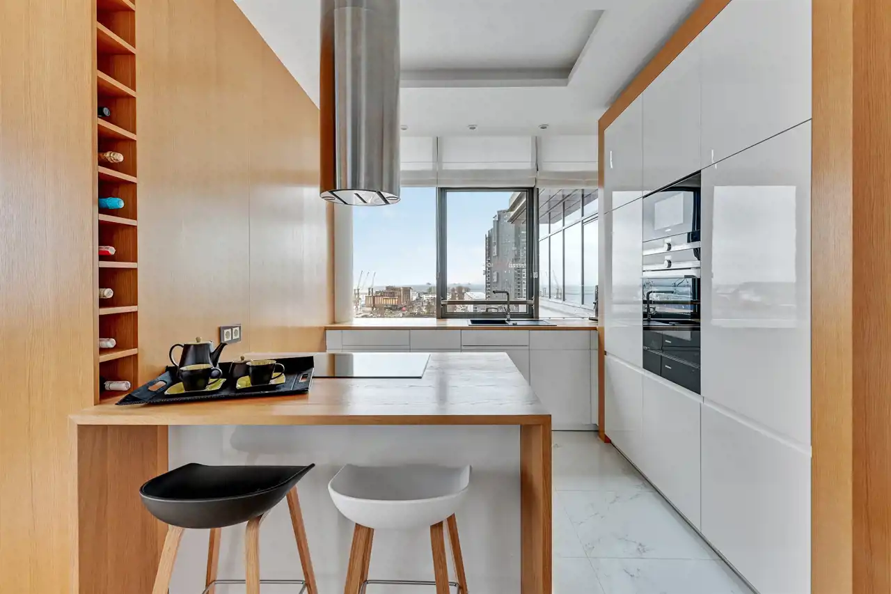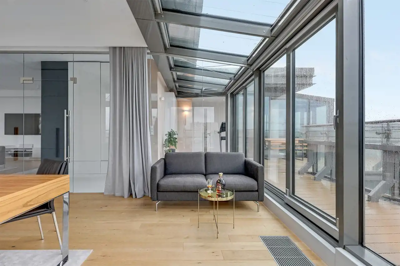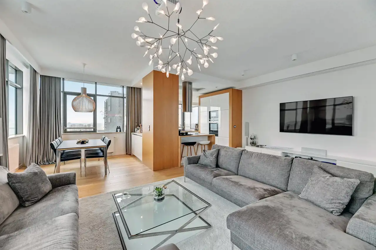Apartament o powierzchni 157,75 m2 zlokalizowany jest na ostatnim, jedenastym piętrze budynku, a na jego powierzchnię składa się salon z aneksem kuchennym, sypialnia, gabinet, łazienka, toaleta i przedpokój. Zachwycający penthouse, z którego nieskrępowanie rozciąga się panoramiczny widok na tętniący życiem krajobraz Gdyni, a okalający cały apartament taras tylko potęguje te wrażenia. Ogromny salon wyposażony w stylowe, popielate kanapy jest sercem mieszkania, z którego dostaniemy się do wszystkich pozostałych pomieszczeń. Bezpośrednio do pokoju dziennego przylega aneks kuchenny z funkcjonalną wyspą i pojemną zabudową meblową, a także pełnym wyposażeniem AGD od renomowanych producentów. Strefa jadalniana oferuje rozkładany stół z sześcioma krzesłami w komplecie. Przestronną sypialnię stanowi wygodne, małżeńskie łóżko, telewizor i niezmiennie zachwycający widok. Duża łazienka z wanną pozwala na odrobinę relaksu, a toaleta dla gości zapewnia intymność domowników. W nieruchomości zainstalowano klimatyzację oraz nagłośnienie. Doskonała propozycja dla osób poszukujących wyjątkowej nieruchomości w wyjątkowej lokalizacji.