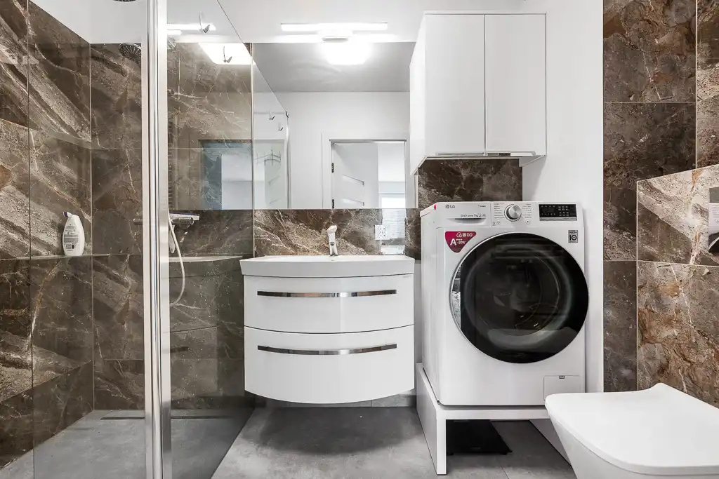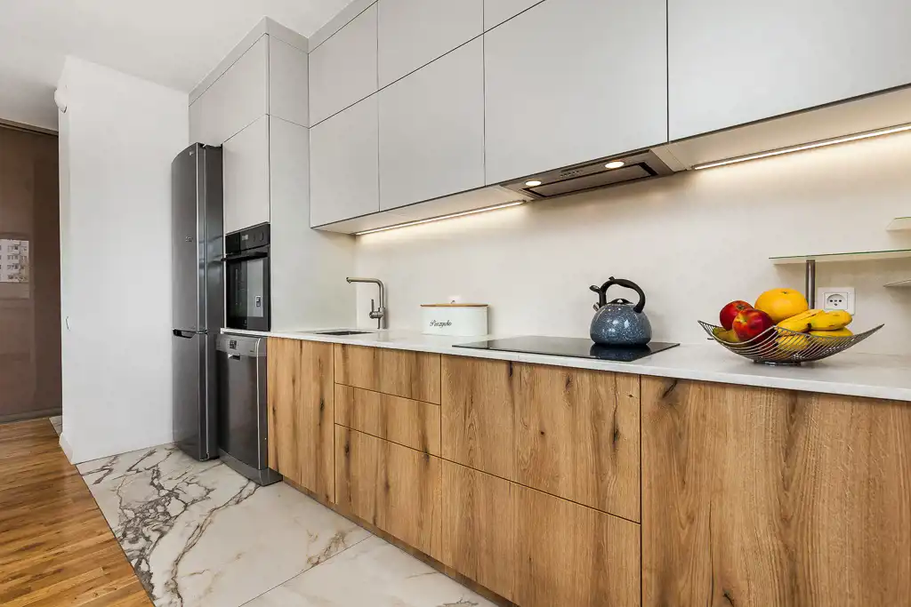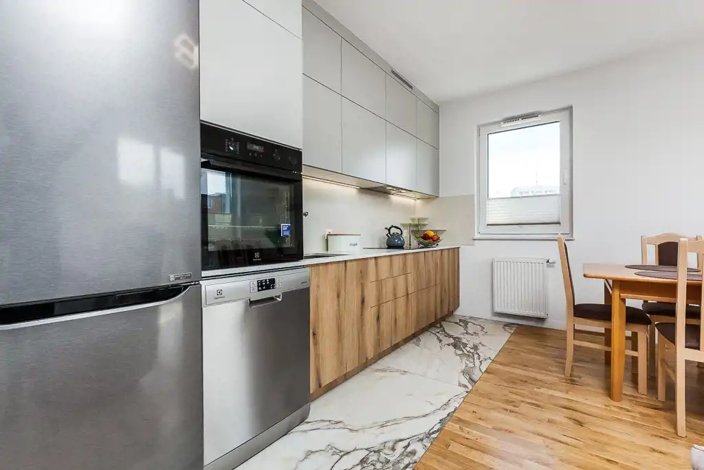 Podłogi wyłożone wysokiej klasy gresem szkliwionym oraz parkietem dębowym – charakteryzują się pięknym efektem wizualnym oraz są praktyczne w utrzymaniu.