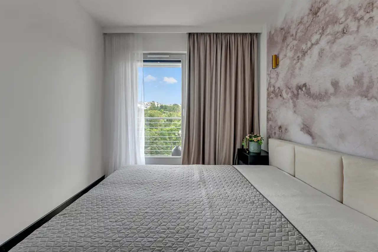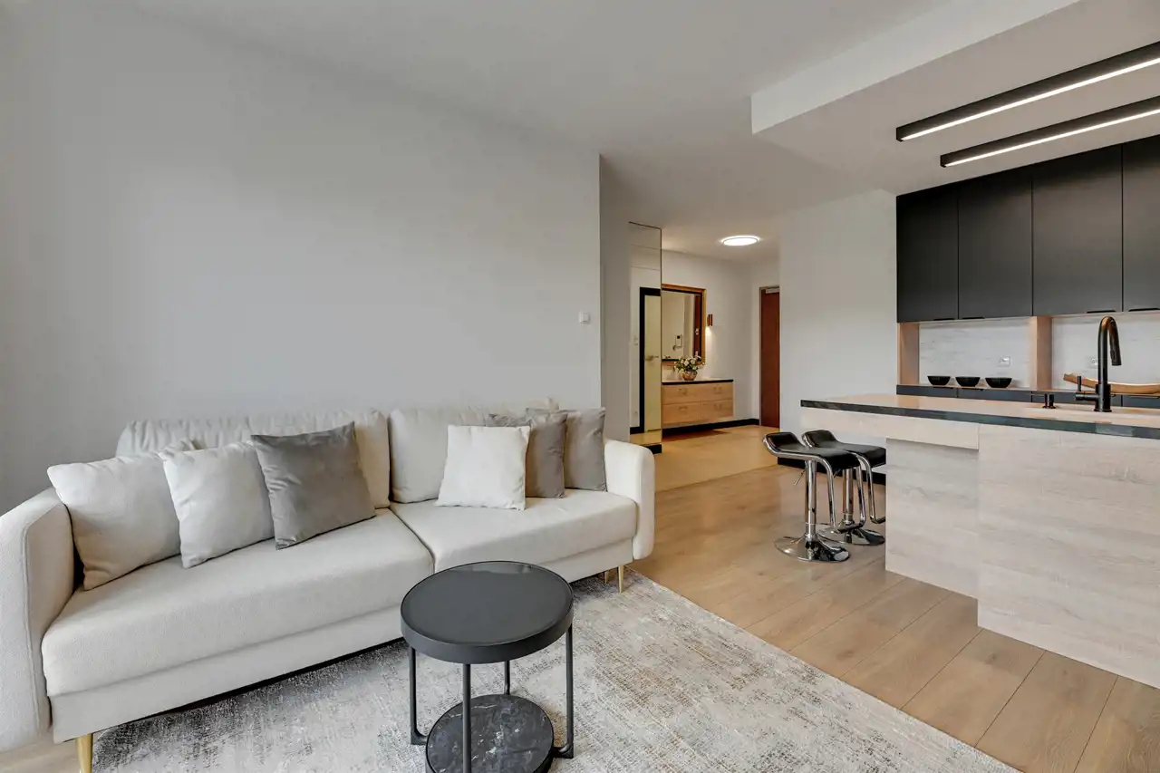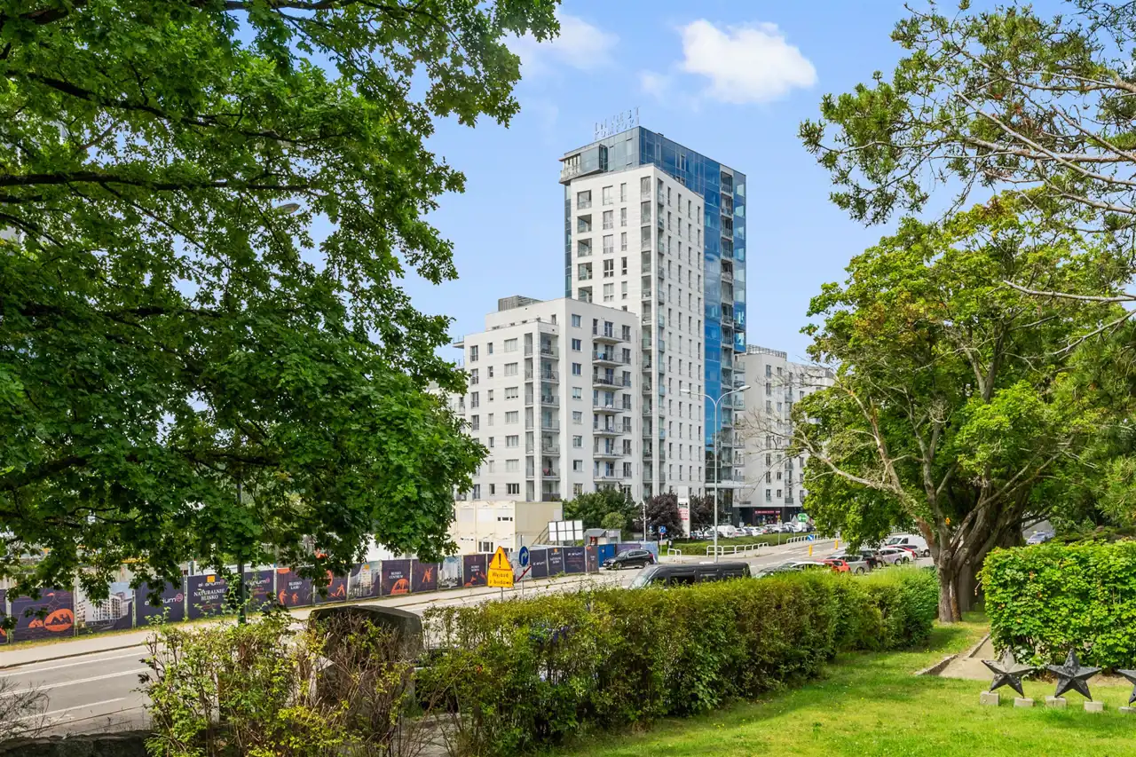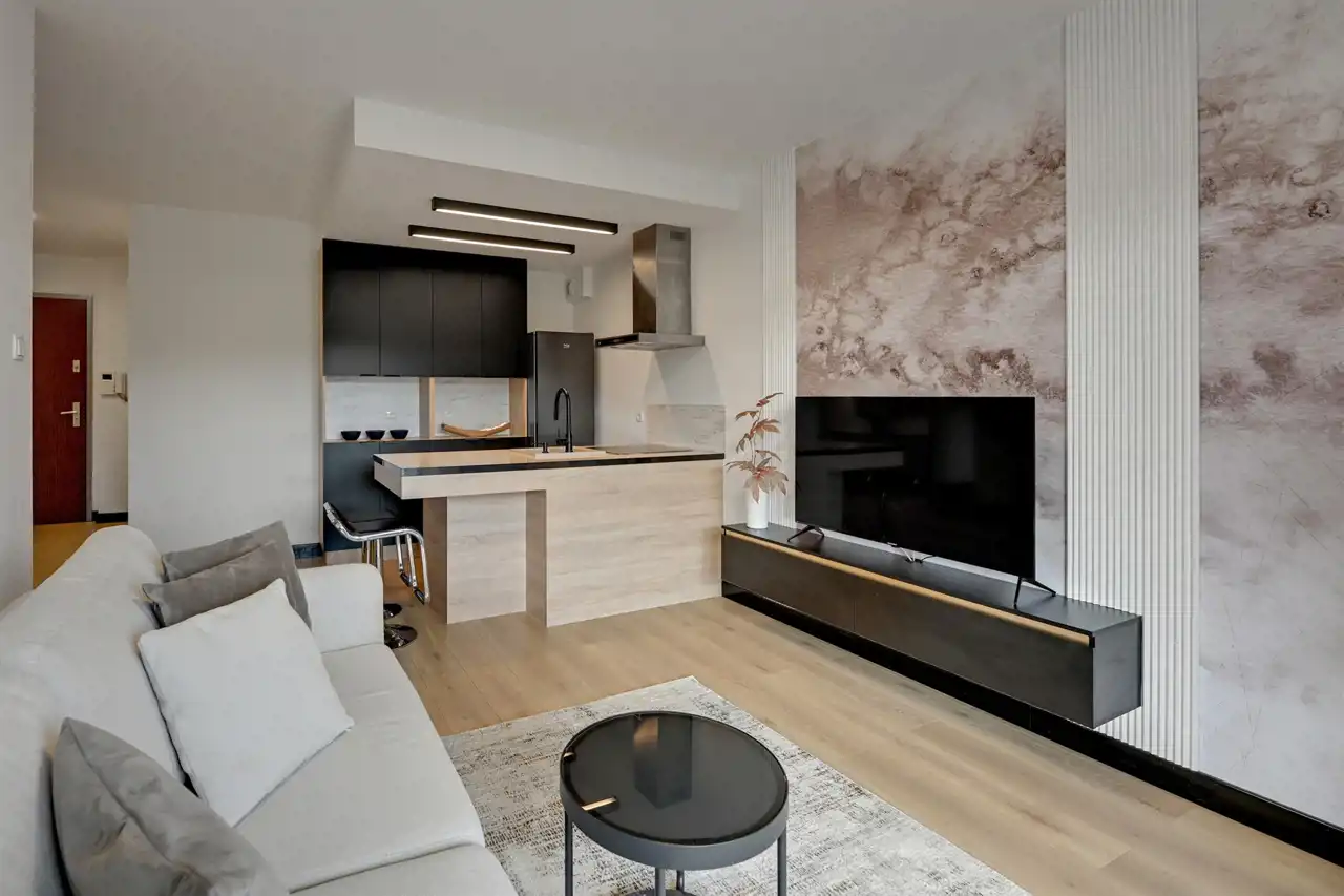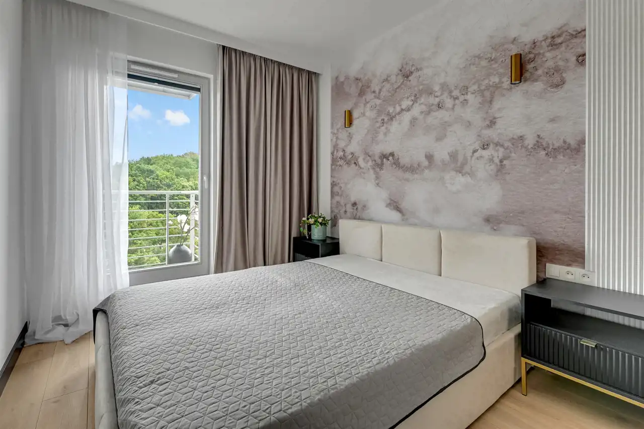 Nieruchomość znajduje się na 5 piętrze, a swoją powierzchnią 46 m2 obejmuje: salon z aneksem kuchennym, sypialnię, łazienkę i przedpokój. Apartament zaaranżowany został w stonowanych, pastelowych barwach z dominującym beżem i jasnym drewnem. Wysokie, balkonowe okna rozświetlają salon, dając poczucie przestrzeni. Serce mieszkania to przytulna część rekreacyjna z jasną sofą, kawowym stolikiem i telewizorem. Bezpośrednio z salonu można wyjść na balkon, z którego rozciąga się widok na zieloną część miasta. Aneks kuchenny z wyspą zaaranżowano w modnych odcieniach czerni i przełamanymi chłodnym drewnem. Sypialnia oferuje duże, małżeńskie łóżko oraz bardzo praktyczną i pojemną szafę garderobianą. Skąpana w ciepłych beżach łazienka zapewnia wygodną zabudowę meblową, kabinę prysznicową, umywalkę i toaletę. Apartament przeszedł gruntowny remont w ubiegłym roku.