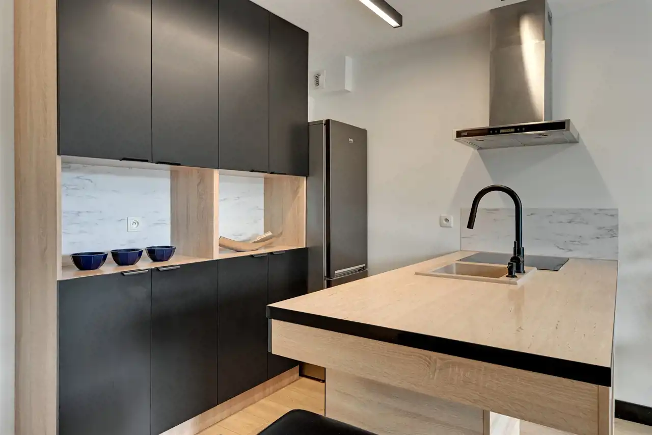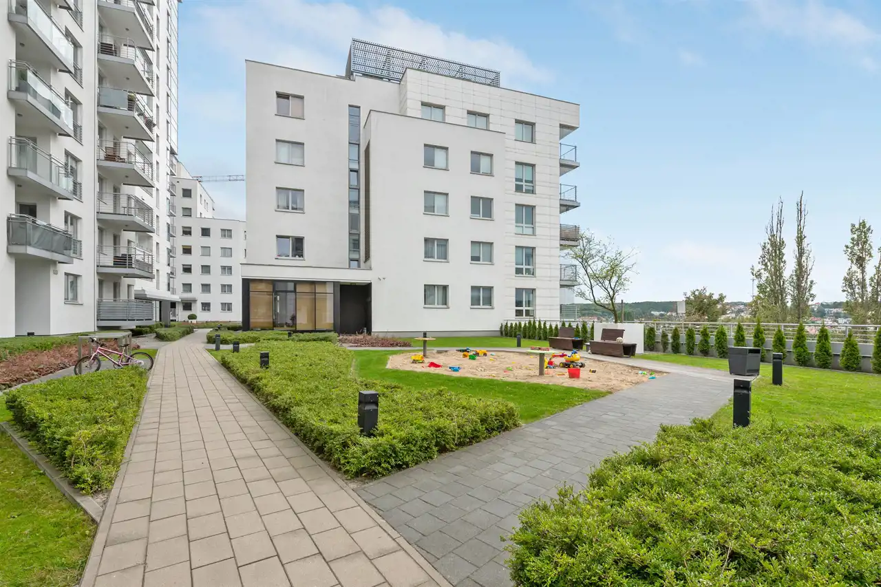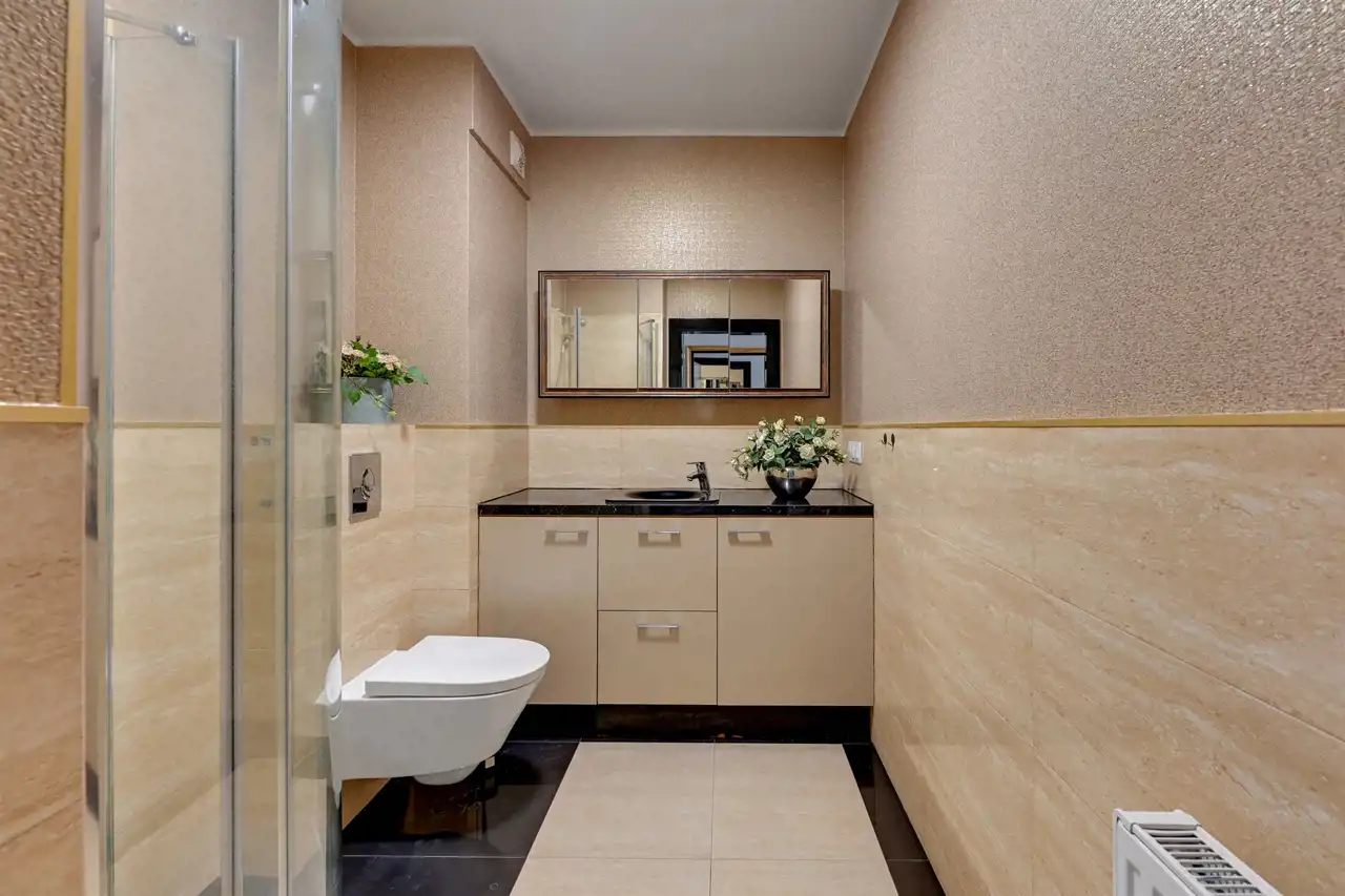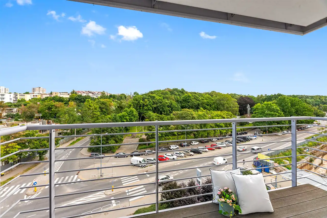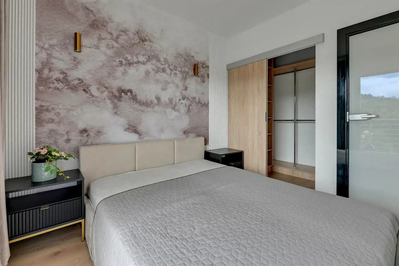 Nieruchomość znajduje się na 5 piętrze, a swoją powierzchnią 46 m2 obejmuje: salon z aneksem kuchennym, sypialnię, łazienkę i przedpokój. Apartament zaaranżowany został w stonowanych, pastelowych barwach z dominującym beżem i jasnym drewnem. Wysokie, balkonowe okna rozświetlają salon, dając poczucie przestrzeni. Serce mieszkania to przytulna część rekreacyjna z jasną sofą, kawowym stolikiem i telewizorem. Bezpośrednio z salonu można wyjść na balkon, z którego rozciąga się widok na zieloną część miasta. Aneks kuchenny z wyspą zaaranżowano w modnych odcieniach czerni i przełamanymi chłodnym drewnem. Sypialnia oferuje duże, małżeńskie łóżko oraz bardzo praktyczną i pojemną szafę garderobianą. Skąpana w ciepłych beżach łazienka zapewnia wygodną zabudowę meblową, kabinę prysznicową, umywalkę i toaletę. Apartament przeszedł gruntowny remont w ubiegłym roku.