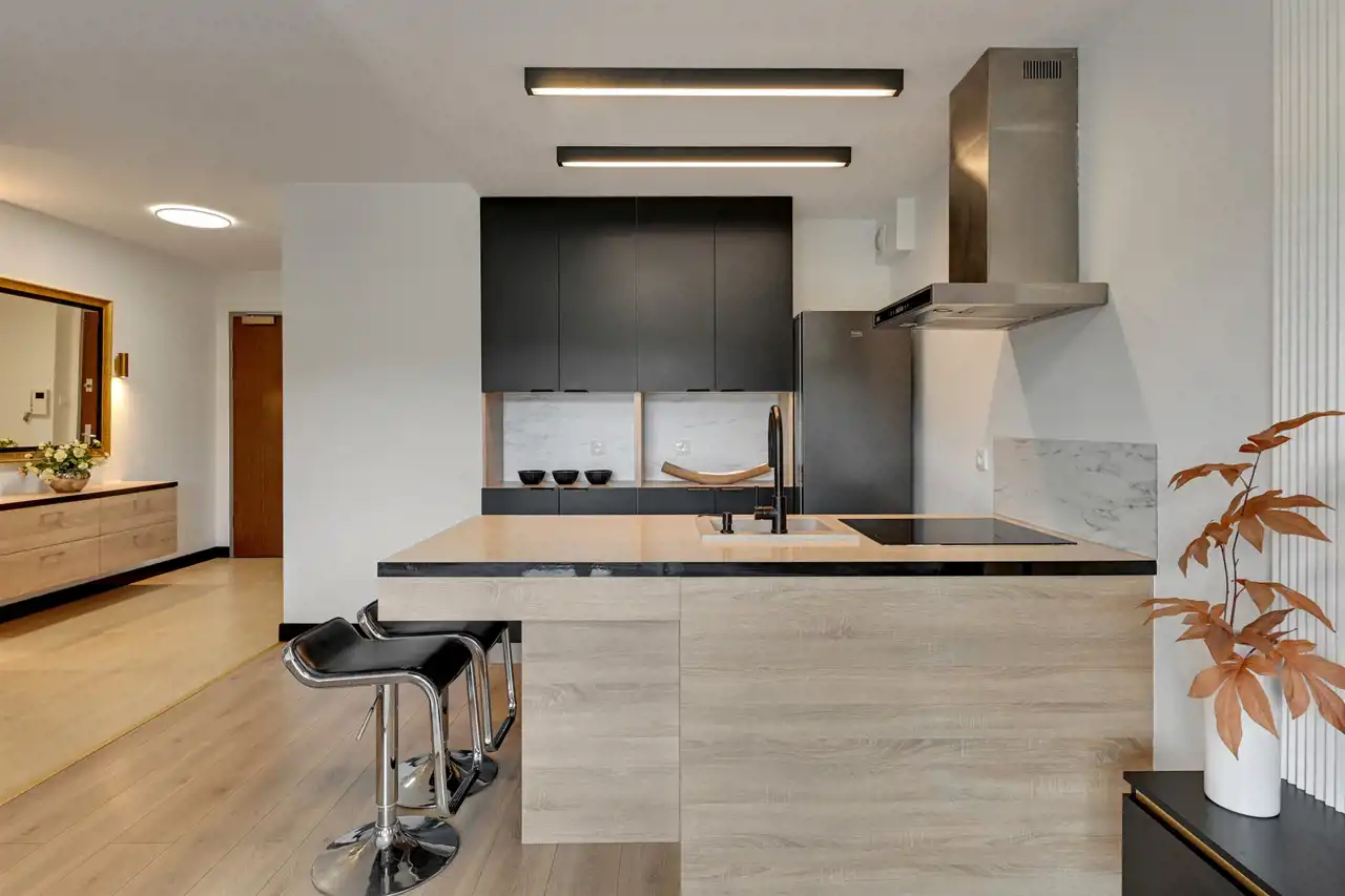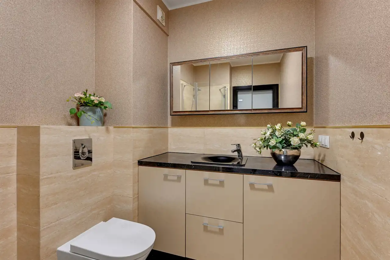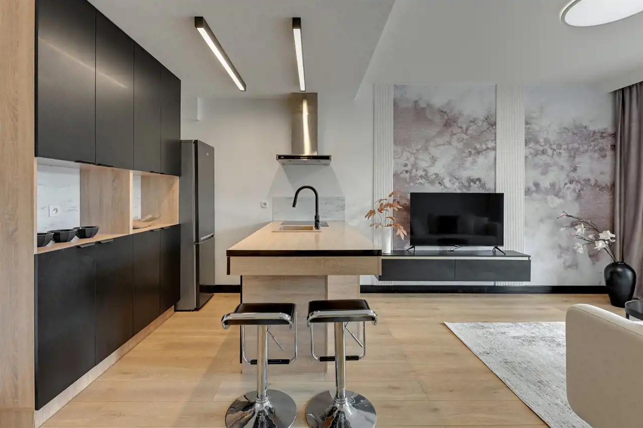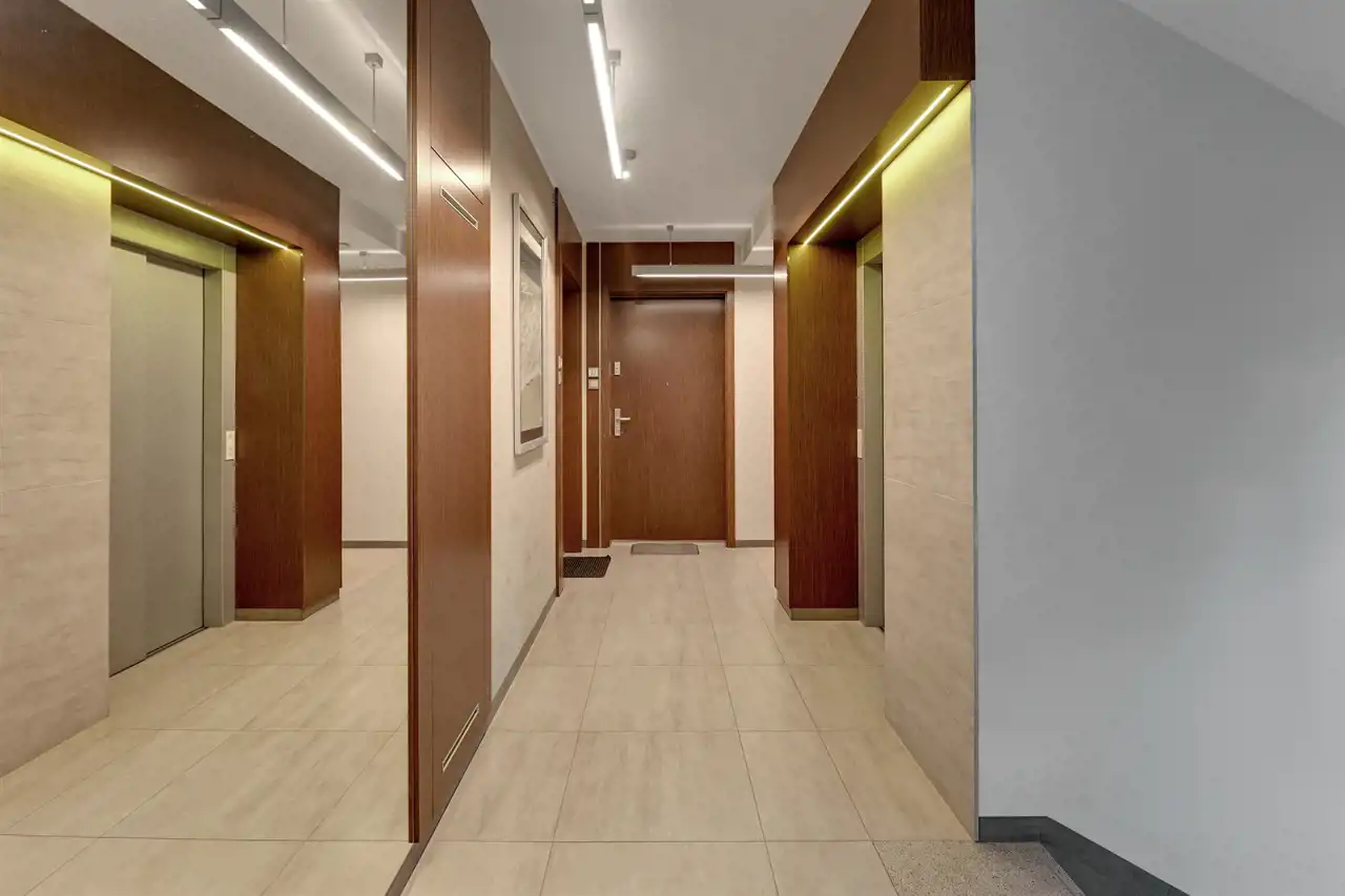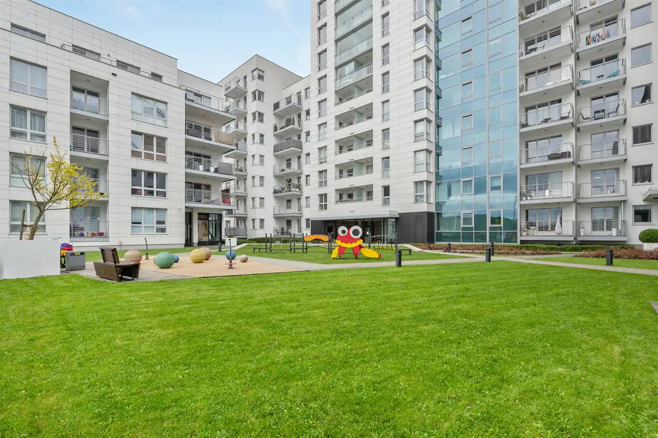 Nieruchomość znajduje się na 5 piętrze, a swoją powierzchnią 46 m2 obejmuje: salon z aneksem kuchennym, sypialnię, łazienkę i przedpokój. Apartament zaaranżowany został w stonowanych, pastelowych barwach z dominującym beżem i jasnym drewnem. Wysokie, balkonowe okna rozświetlają salon, dając poczucie przestrzeni. Serce mieszkania to przytulna część rekreacyjna z jasną sofą, kawowym stolikiem i telewizorem. Bezpośrednio z salonu można wyjść na balkon, z którego rozciąga się widok na zieloną część miasta. Aneks kuchenny z wyspą zaaranżowano w modnych odcieniach czerni i przełamanymi chłodnym drewnem. Sypialnia oferuje duże, małżeńskie łóżko oraz bardzo praktyczną i pojemną szafę garderobianą. Skąpana w ciepłych beżach łazienka zapewnia wygodną zabudowę meblową, kabinę prysznicową, umywalkę i toaletę. Apartament przeszedł gruntowny remont w ubiegłym roku.