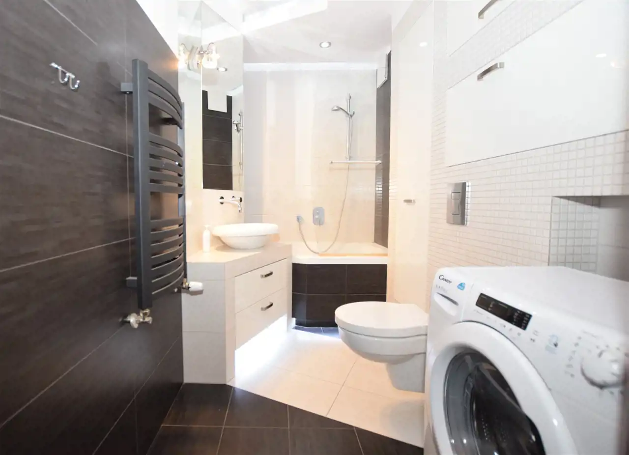 - łazienka z WC, wanną i pralką