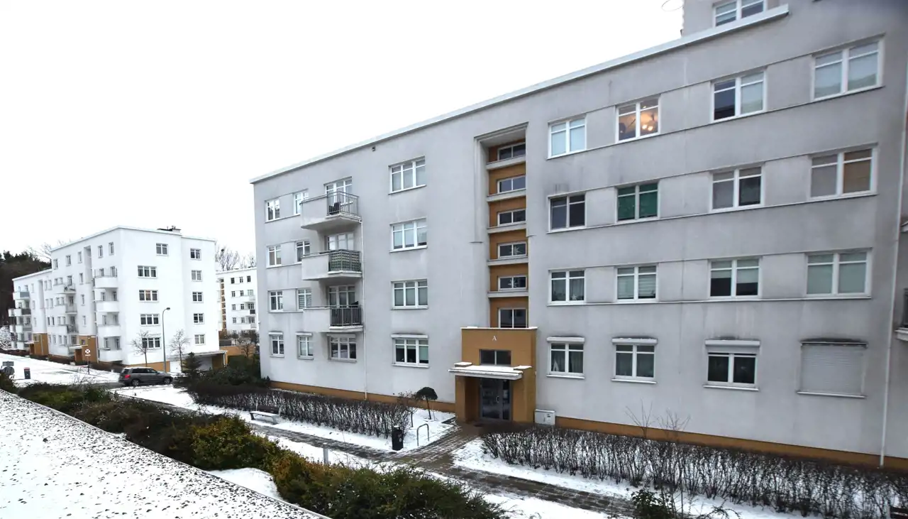zadbany budynek z windą i domofonem