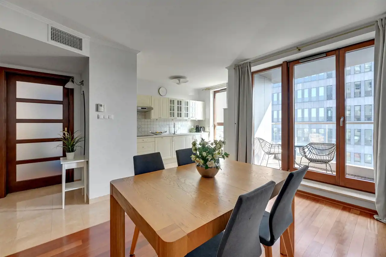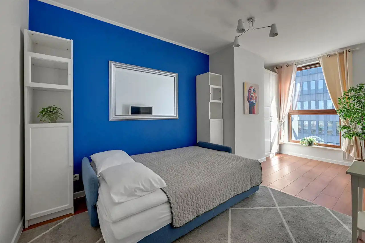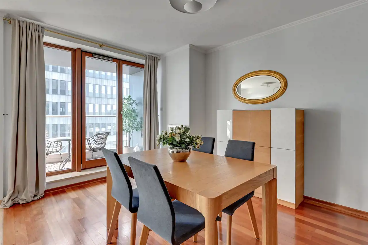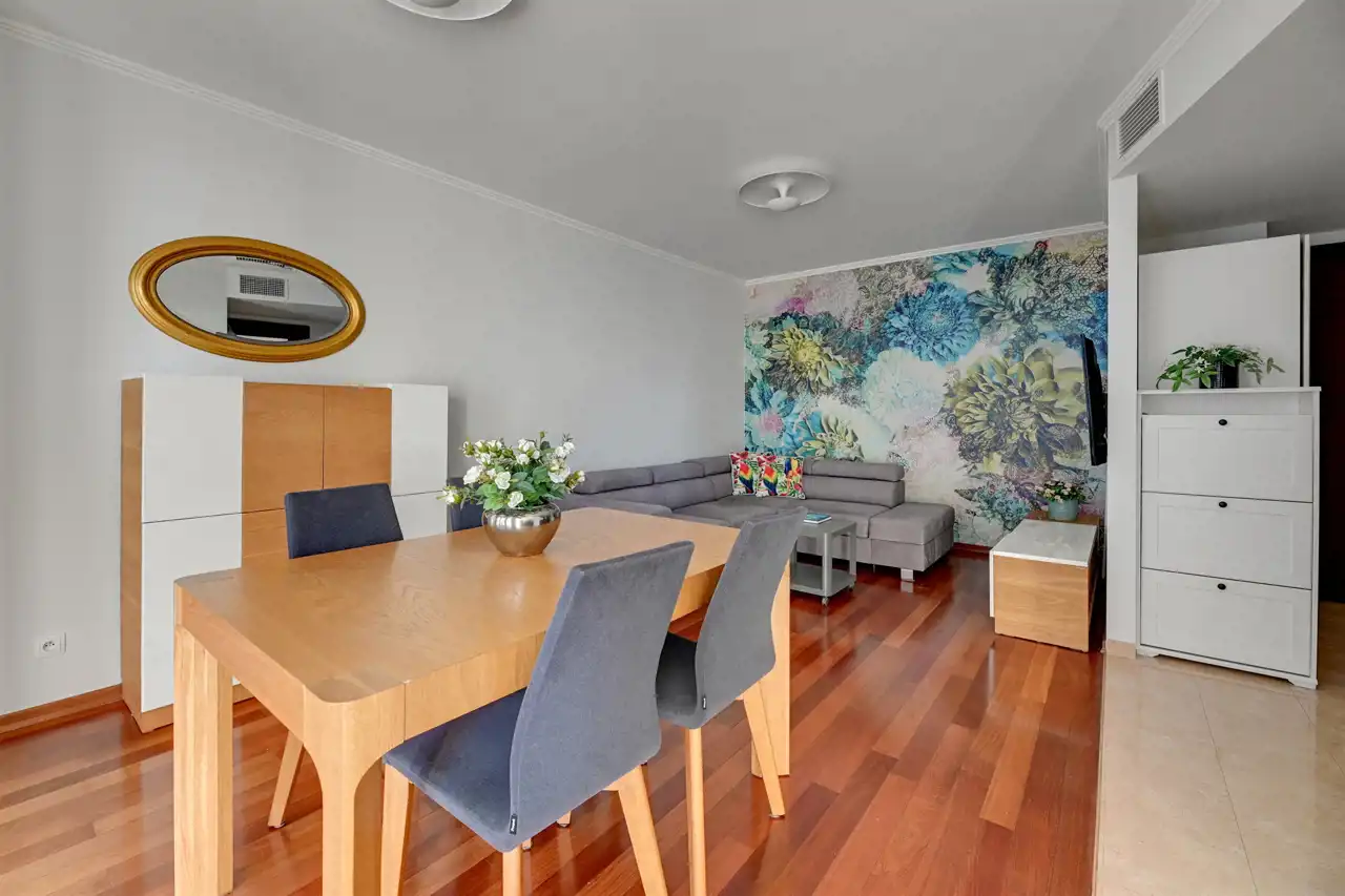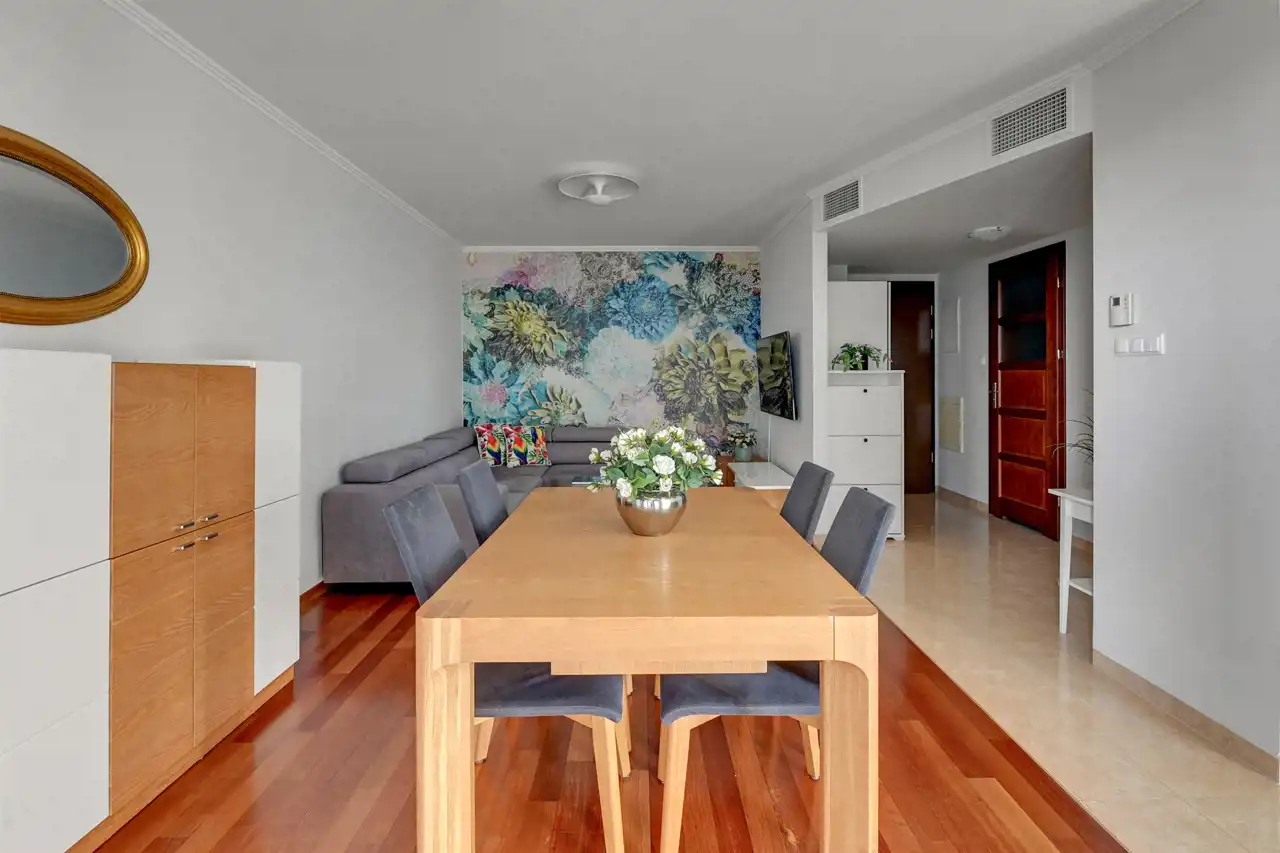 The apartment is located on the 10th floor, and the area of 60 m2 includes: a living room with a kitchenette, bedroom, a hall and a bathroom with a toilet. A modern and spacious apartment is a perfect proposition for people who appreciate beautiful landscapes and life in the city center. The property has been stylishly and tastefully decorated, gray colors with colorful decorative elements make the user comfortable. The living room has a corner sofa, coffee table and a TV set with a TV cabinet. A solid, wooden dining table with four chairs ignites the desire to eat frequent meals with family and friends. Kitchen furniture in a rustic style in light colors fits perfectly with the decor of the living room. The kitchenette is equipped with the most necessary household appliances (electric hob, oven, microwave, dishwasher), where you can easily prepare exquisite foods. A morning coffee or an evening glass of wine is a perfect combination with a balcony and a side view of the Gdańsk Bay and the yacht marina. The bedroom is equipped with a comfortable sofa bed, TV and storage space. The last room is a very spacious bathroom with a shower cubicle, washbasin, bidet and a large mirror, finished with glaze and terracotta in natural colors, which makes the interior neutral and gentle to the eye. The property is intended for people who appreciate modernity and location prestige.