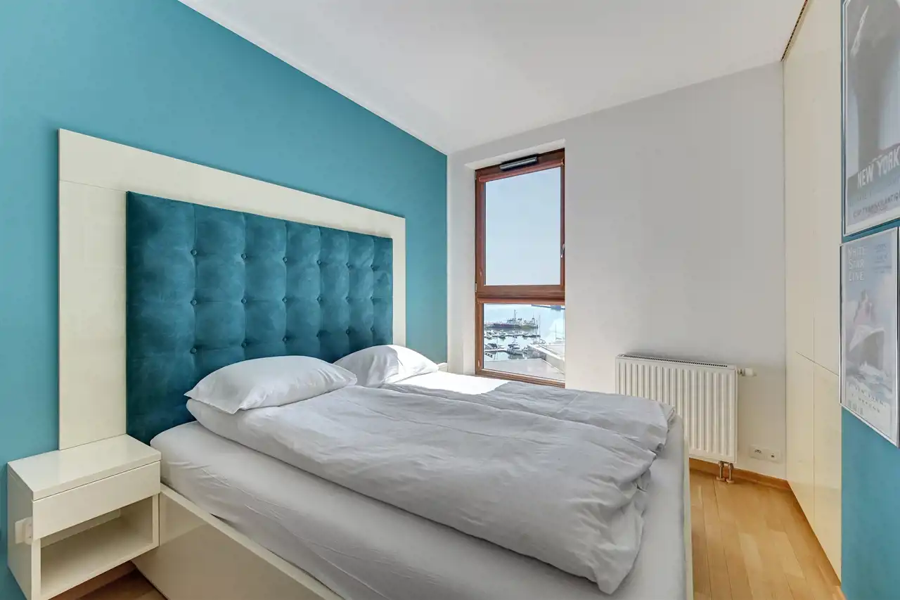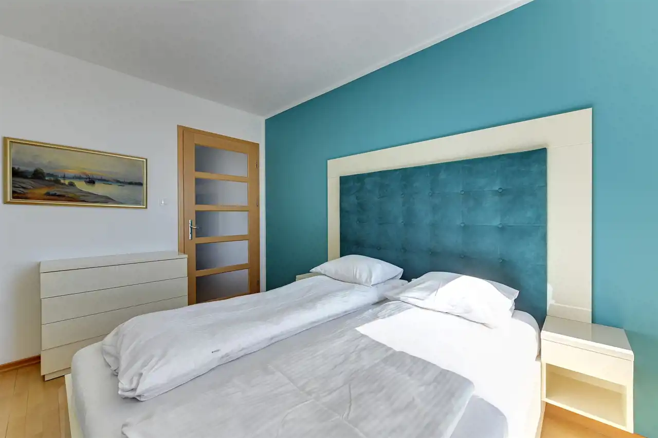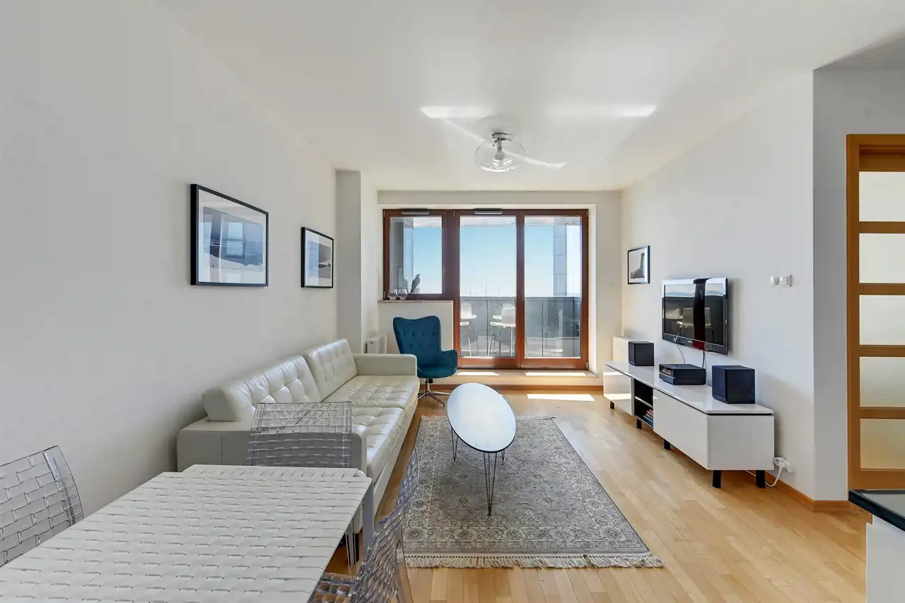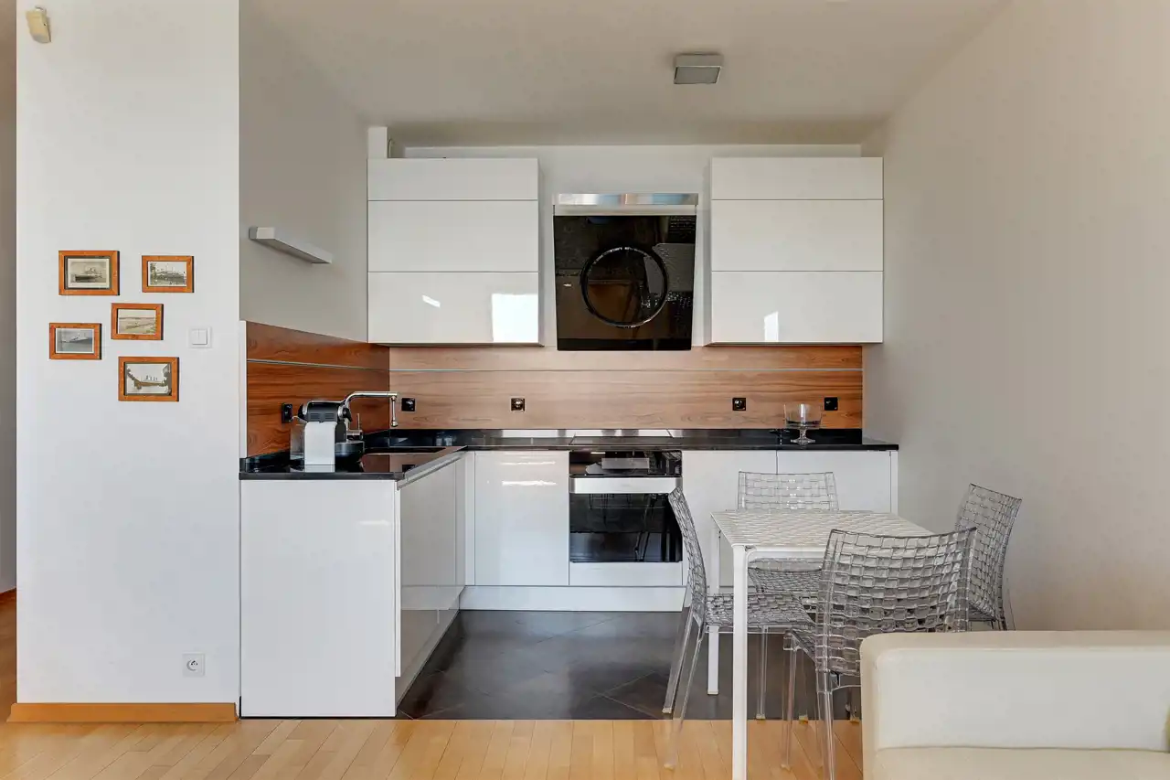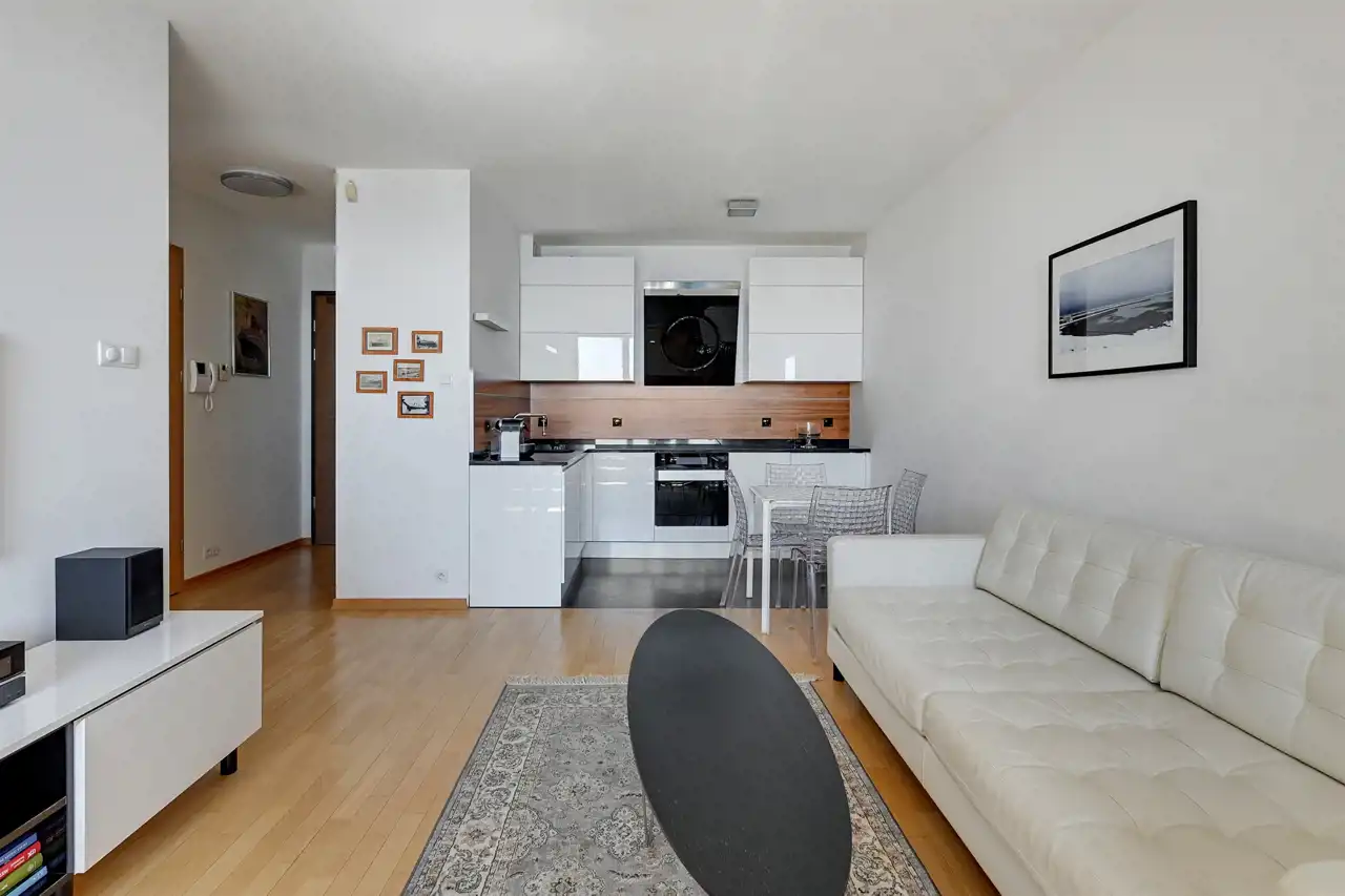The flat is located on the 9th floor of the Sea Towers complex. Its area of 45.8 m2 consists of a living room with a kitchenette, bedroom, bathroom, hallway and balcony. The flat has been arranged in light, classic shades, adding warmth and space to the interior. The living room, illuminated by a double-hung balcony window, is the perfect place for both relaxing and socialising. A large leather sofa with a coffee table and TV create a comfortable seating area. The dining table is placed in the kitchen area, which, being equipped with built-in furniture and necessary household appliances, will fully satisfy its function. The living room has an exit to the balcony from which, as well as the entire flat, there is a delightful view of the Bay of Gdańsk. The bedroom has a comfortable double bed with a high headrest, an unusually capacious built-in wardrobe and a practical chest of drawers. The bathroom in shades of beige offers a shower cubicle, washing machine, toilet and washbasin. The flat will be perfect for a single or a couple who are looking for attractive accommodation in the best Gdynia location.