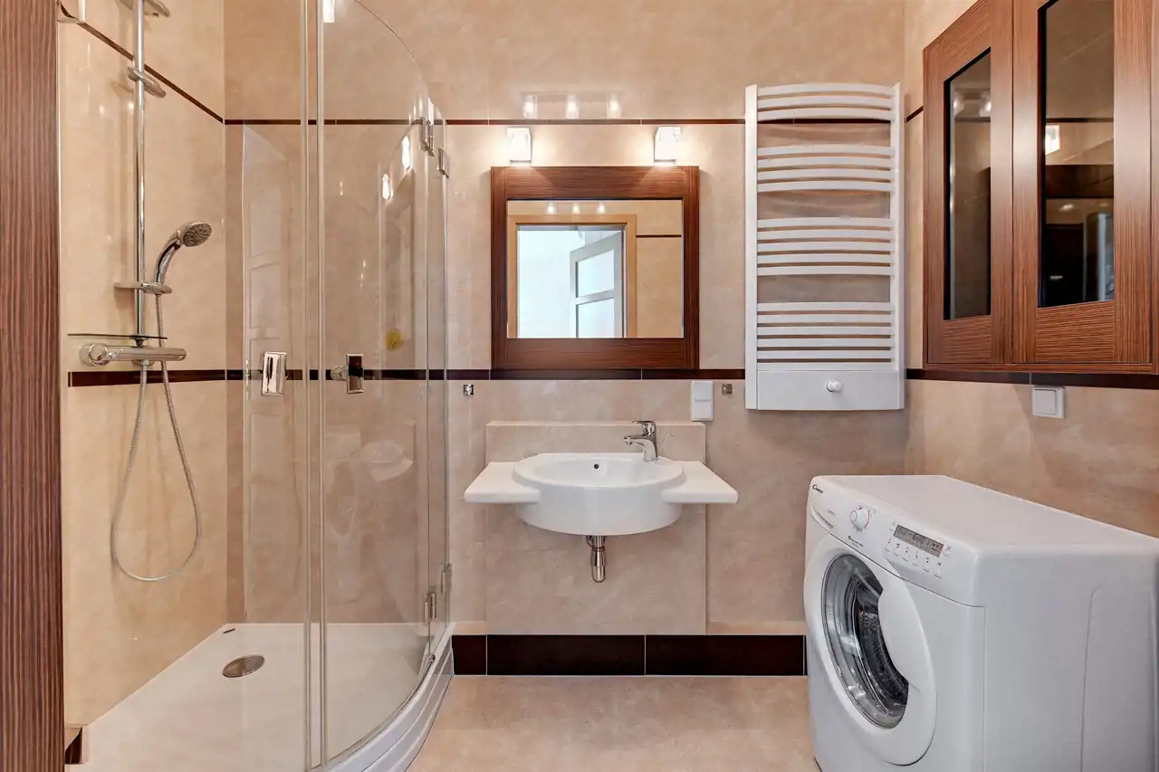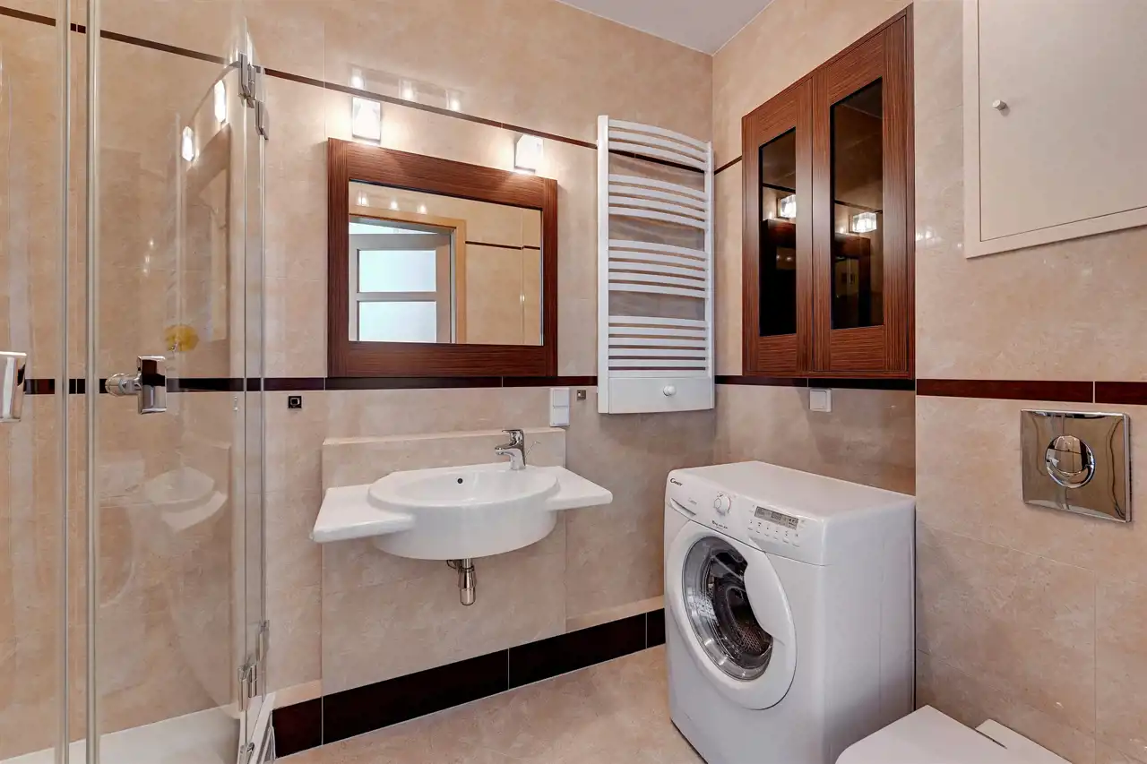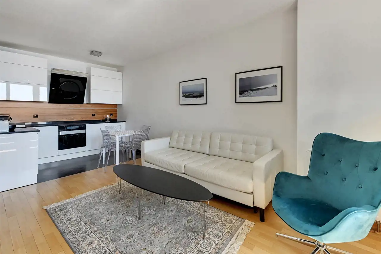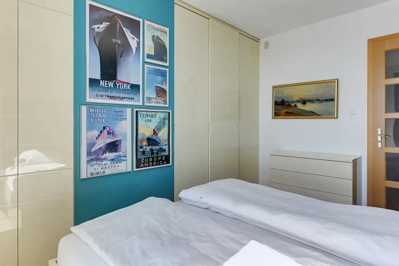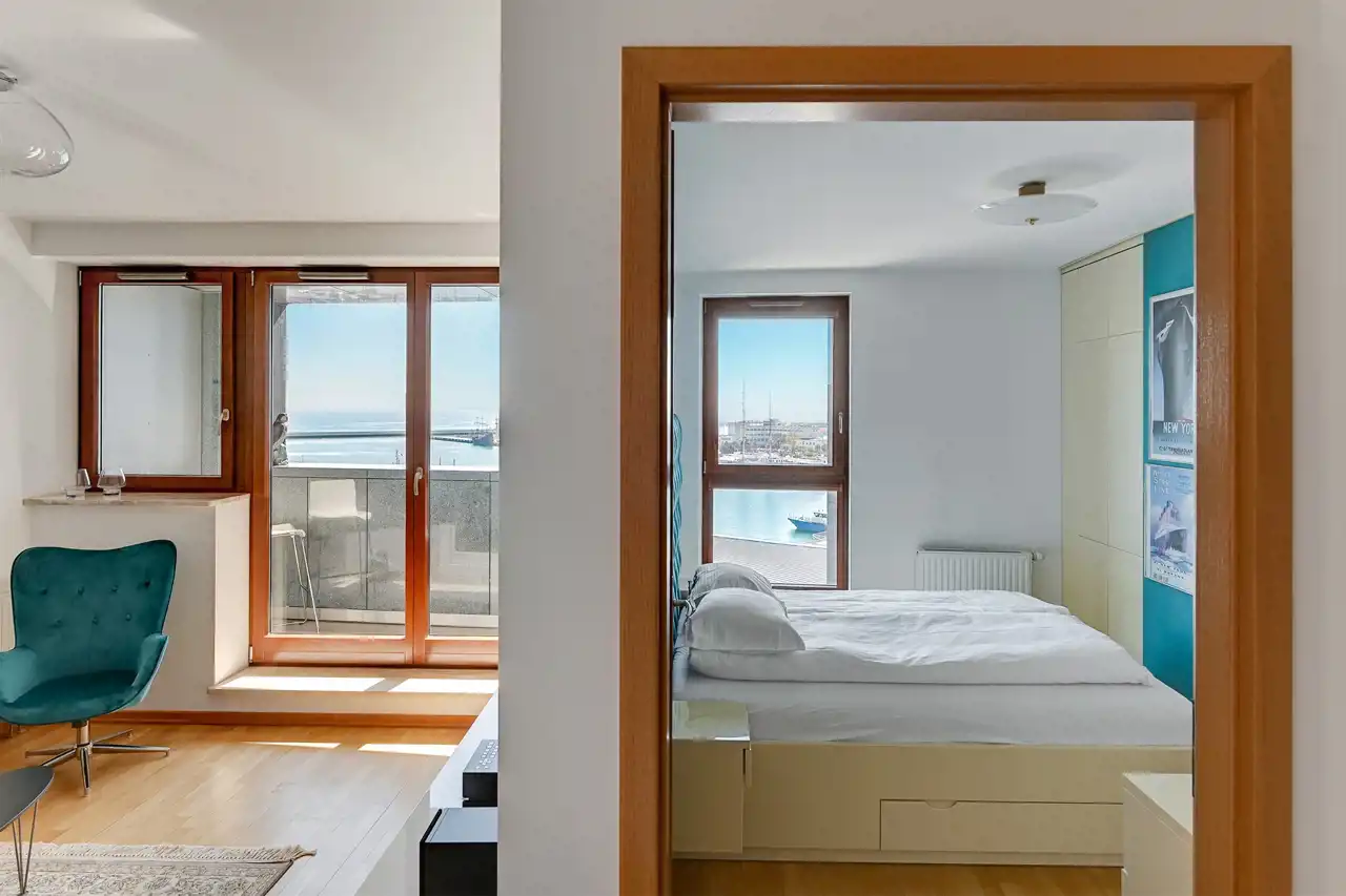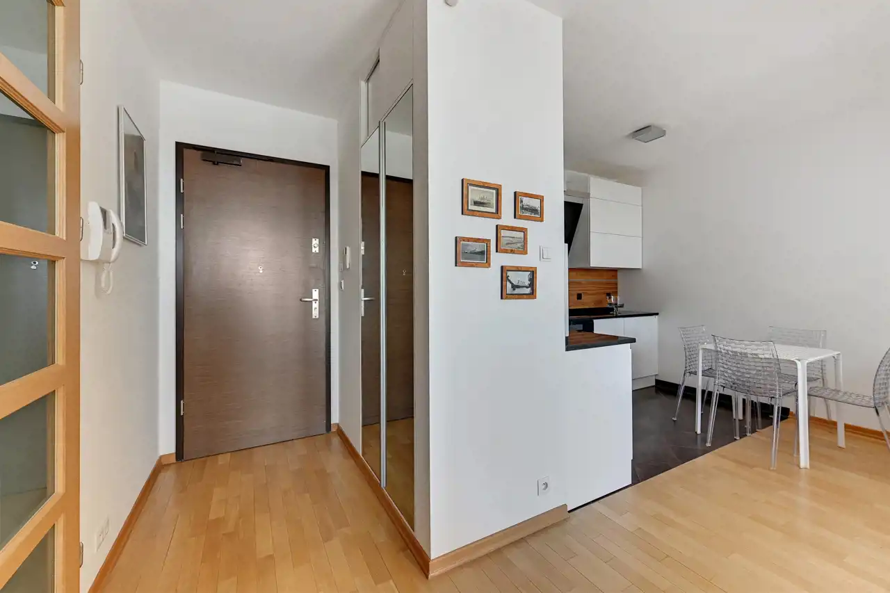 The flat is located on the 9th floor of the Sea Towers complex. Its area of 45.8 m2 consists of a living room with a kitchenette, bedroom, bathroom, hallway and balcony. The flat has been arranged in light, classic shades, adding warmth and space to the interior. The living room, illuminated by a double-hung balcony window, is the perfect place for both relaxing and socialising. A large leather sofa with a coffee table and TV create a comfortable seating area. The dining table is placed in the kitchen area, which, being equipped with built-in furniture and necessary household appliances, will fully satisfy its function. The living room has an exit to the balcony from which, as well as the entire flat, there is a delightful view of the Bay of Gdańsk. The bedroom has a comfortable double bed with a high headrest, an unusually capacious built-in wardrobe and a practical chest of drawers. The bathroom in shades of beige offers a shower cubicle, washing machine, toilet and washbasin. The flat will be perfect for a single or a couple who are looking for attractive accommodation in the best Gdynia location.