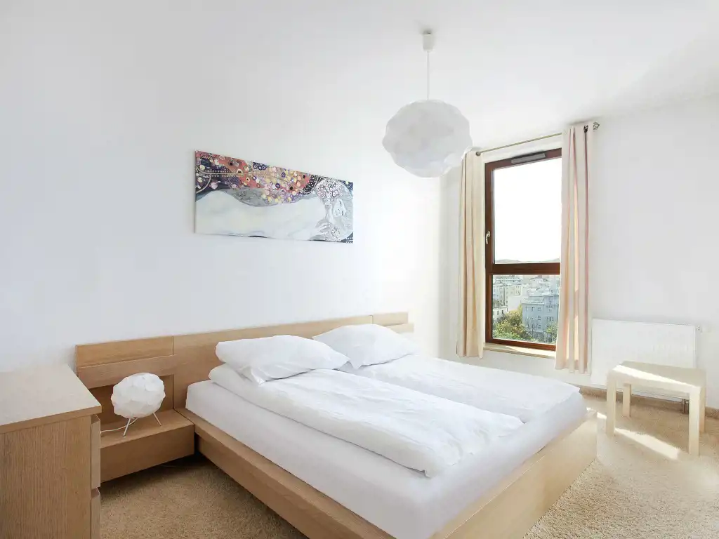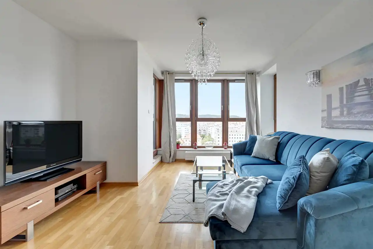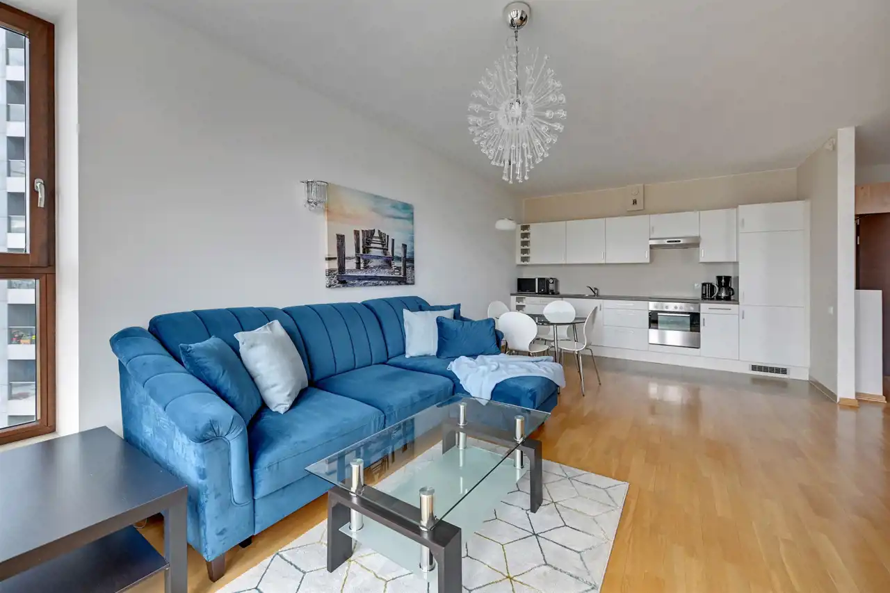 Apartament znajduje się na 6 piętrze (X kondygnacji), a swoją powierzchnią 49 m2 obejmuje: salon z aneksem kuchennym, sypialnię, łazienkę z toaletą oraz przedpokój. Mieszkanie zostało zaaranżowane w klasycznej kolorystyce bieli i jasnego drewna. Przestronny pokój dzienny łączy w sobie część rekreacyjną oraz jadalnianą. Chłodna kolorystyka mebli zjawiskowo kontrastuje z ciepłą tonacją drewnianej podłogi, a modernistyczne wyposażenie pozwala cieszyć się komfortem. Zadbany aneks kuchenny z pełną zabudową gwarantuje wszystkie niezbędne sprzęty AGD. W sypialni, tak jak w reszcie lokalu, postawiono na stonowaną kolorystykę. Modernistyczne, duże, małżeńskie łóżko i praktyczna zabudowa meblowa dominuje w pomieszczeniu. Łazienka oferuje kabinę prysznicową oraz toaletę.