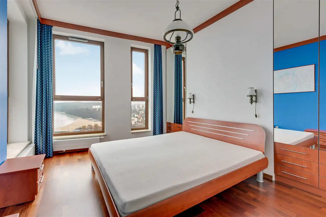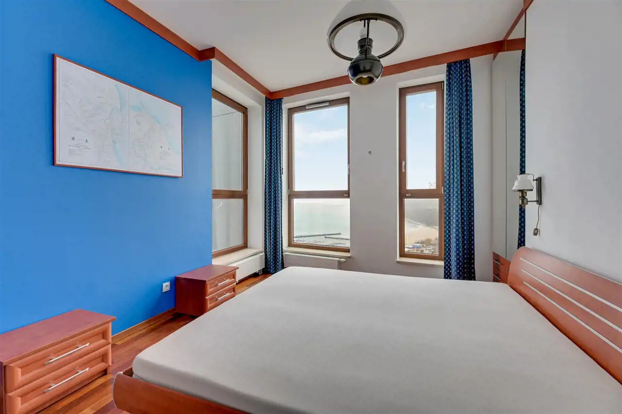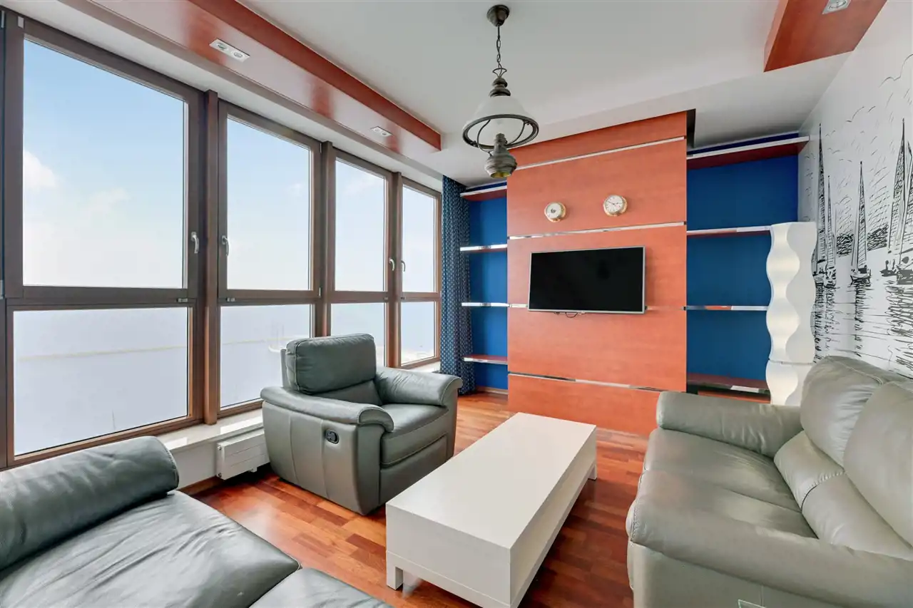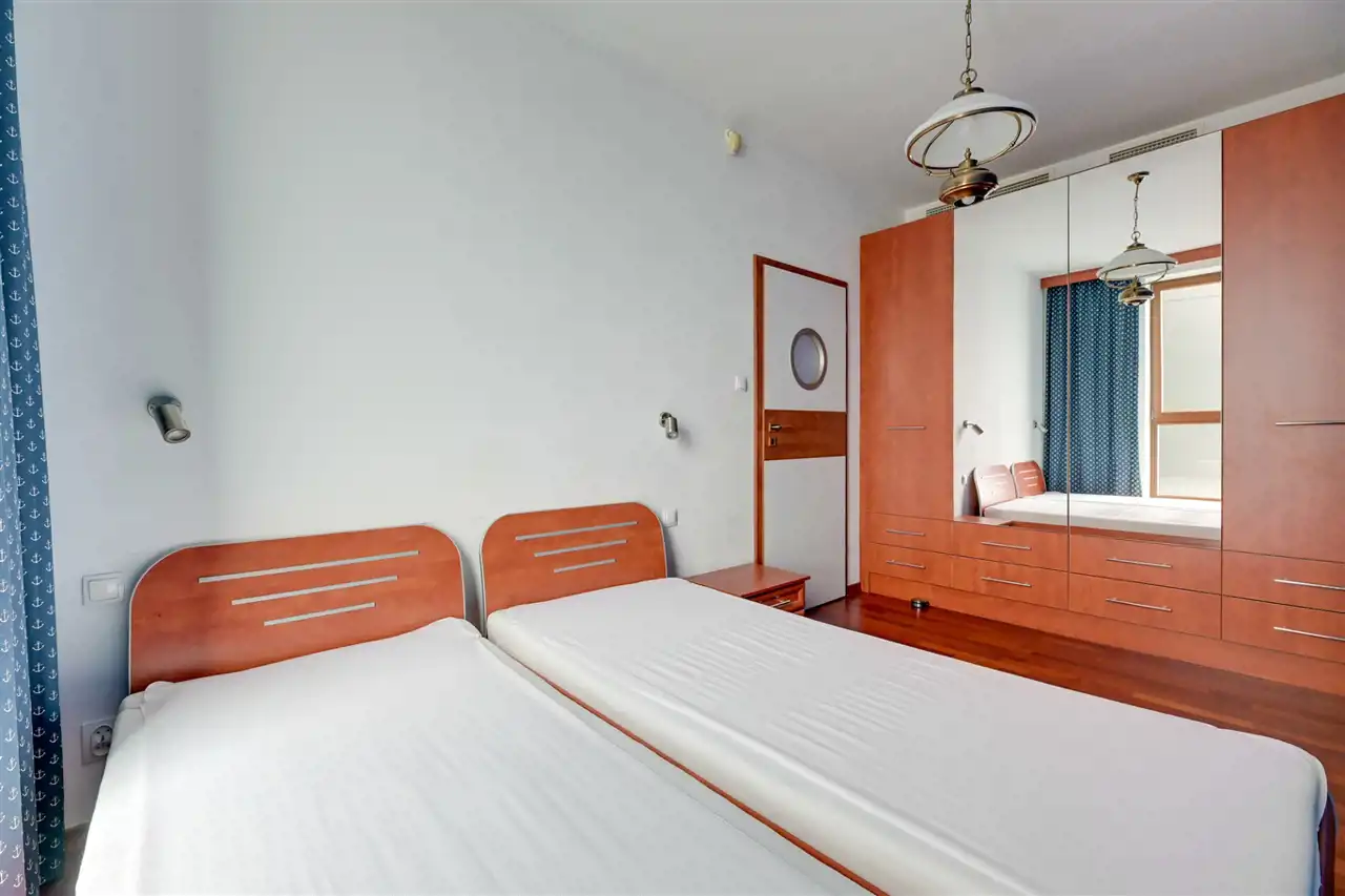 Apartment with an area of 87 m2 with a fantastic view of the bay, which can be admired through the panoramic windows of the living room and both bedrooms. The apartment consists of a living room with a fully equipped kitchenette, two bedrooms, bathroom, wardrobe. The apartment includes a storage room and two places in the garage hall. The apartment has been designed with attention to every detail. The finishes are made of the best materials, to a high standard in a maritime style. The bathroom has a double shower cubicle, which undoubtedly affects the comfort of the bath, there are also two washbasins and a bidet.