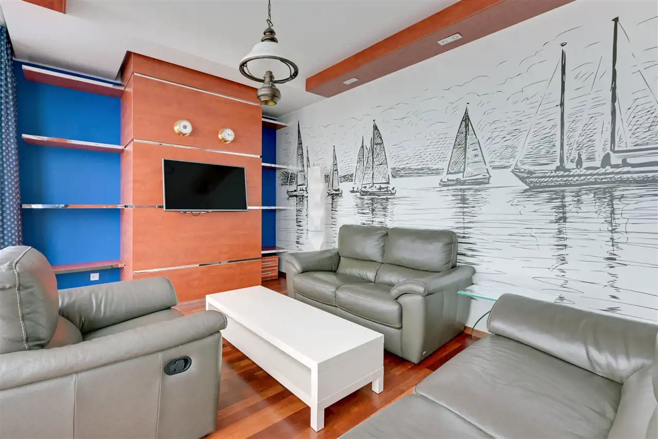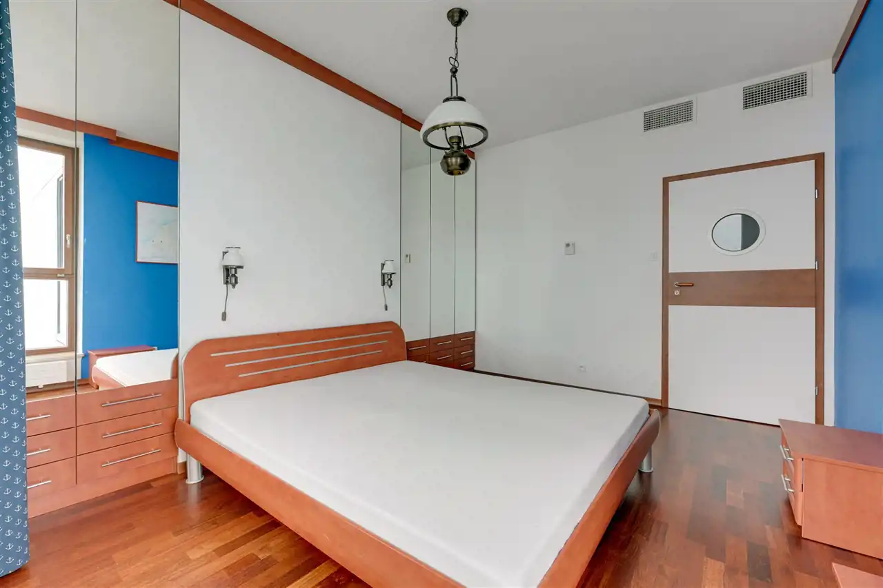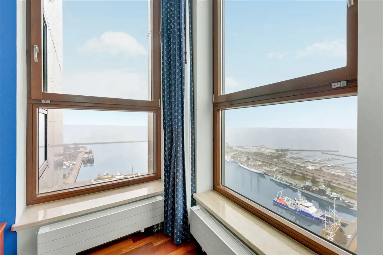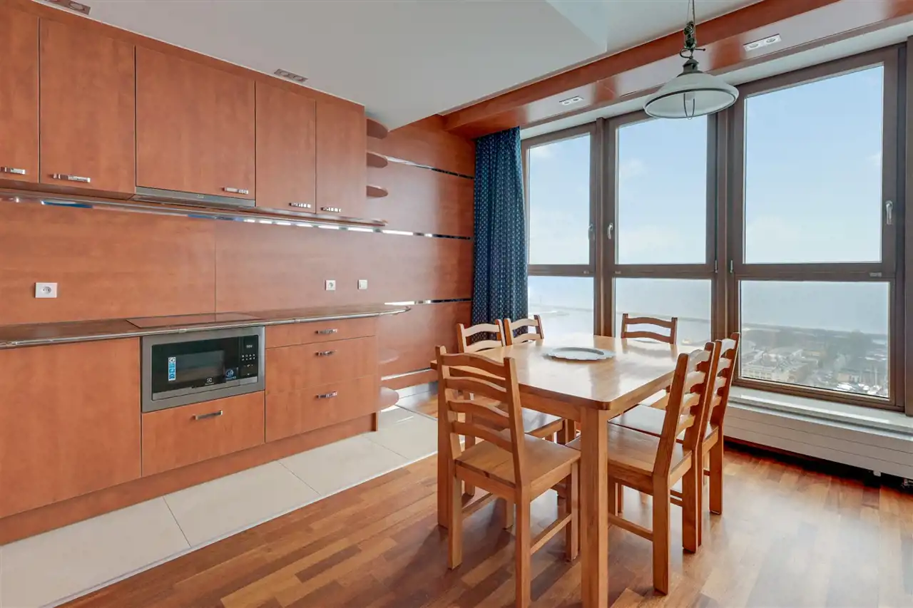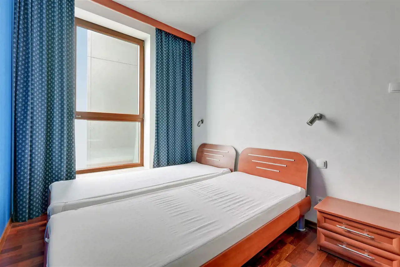 Apartment with an area of 87 m2 with a fantastic view of the bay, which can be admired through the panoramic windows of the living room and both bedrooms. The apartment consists of a living room with a fully equipped kitchenette, two bedrooms, bathroom, wardrobe. The apartment includes a storage room and two places in the garage hall. The apartment has been designed with attention to every detail. The finishes are made of the best materials, to a high standard in a maritime style. The bathroom has a double shower cubicle, which undoubtedly affects the comfort of the bath, there are also two washbasins and a bidet.