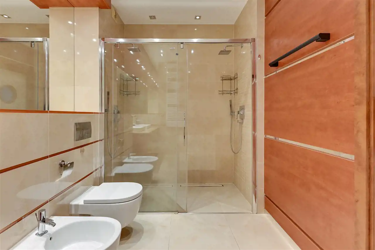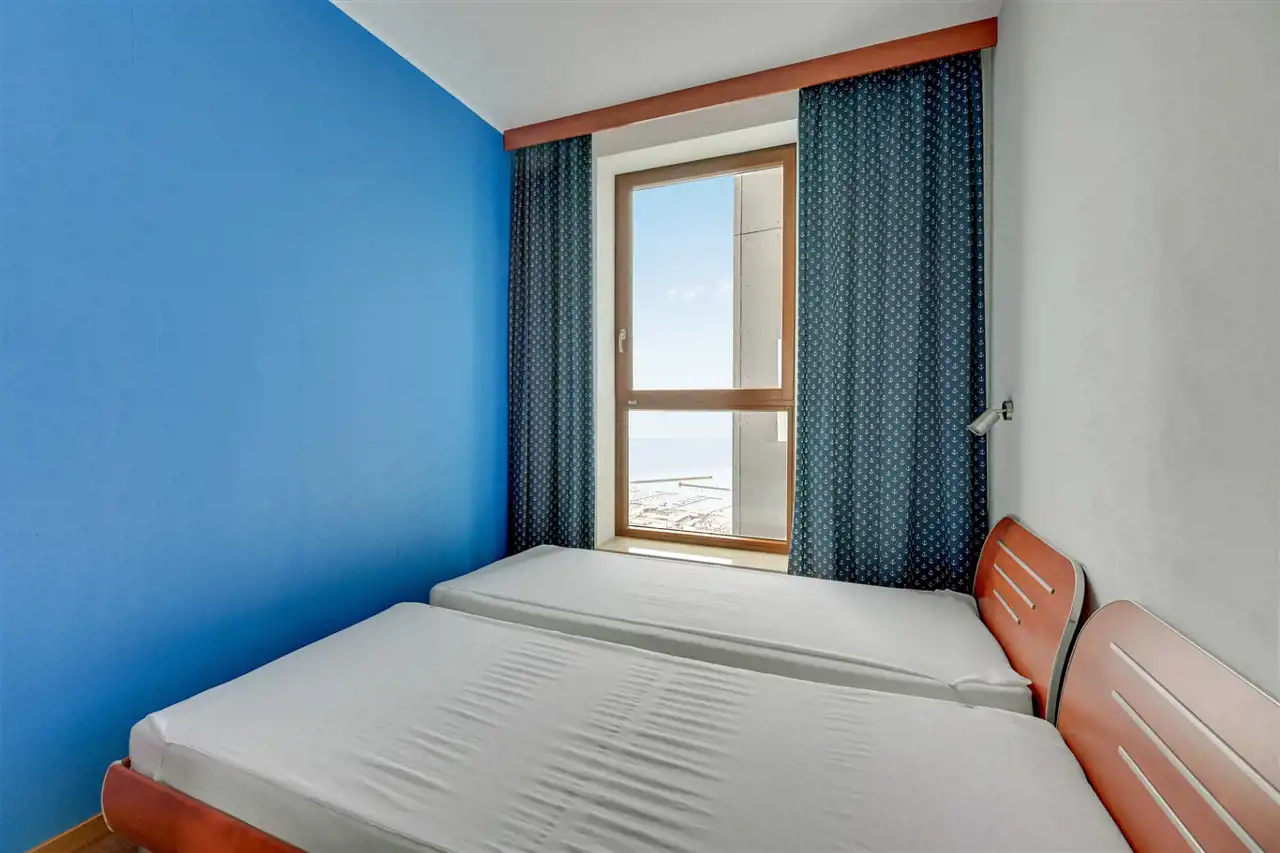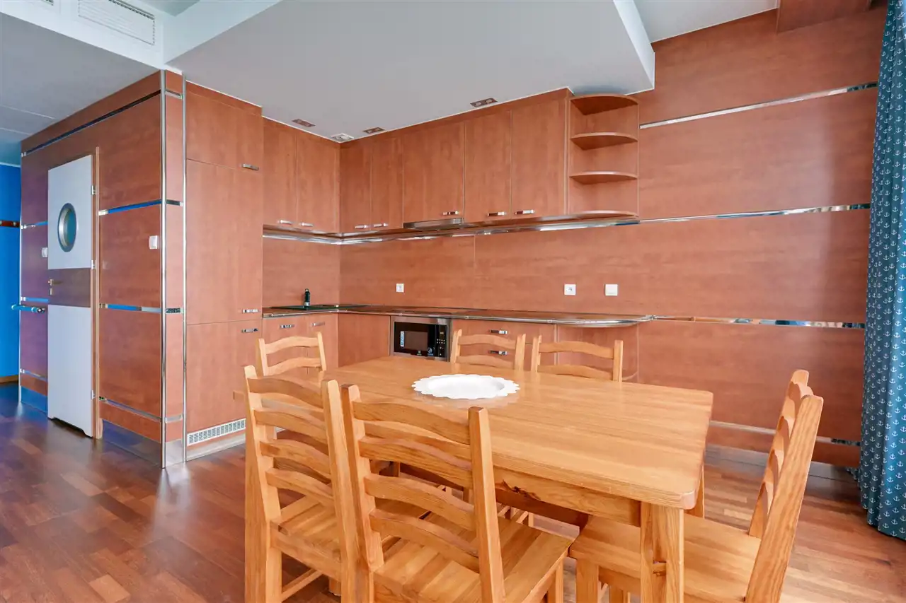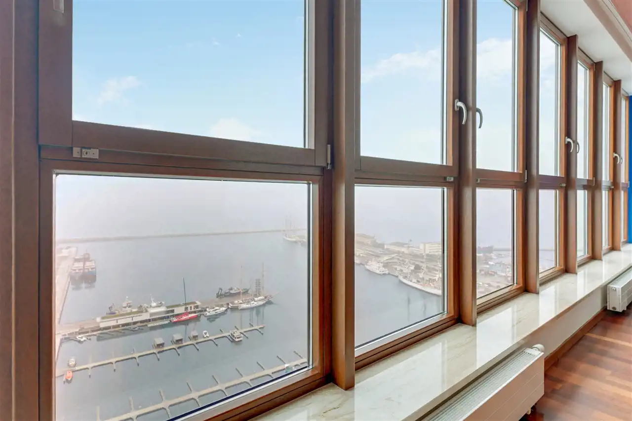 Apartment with an area of 87 m2 with a fantastic view of the bay, which can be admired through the panoramic windows of the living room and both bedrooms. The apartment consists of a living room with a fully equipped kitchenette, two bedrooms, bathroom, wardrobe. The apartment includes a storage room and two places in the garage hall. The apartment has been designed with attention to every detail. The finishes are made of the best materials, to a high standard in a maritime style. The bathroom has a double shower cubicle, which undoubtedly affects the comfort of the bath, there are also two washbasins and a bidet.