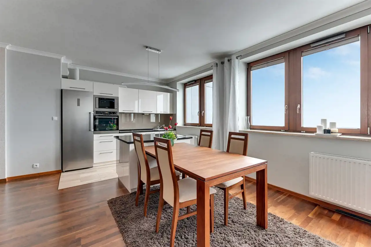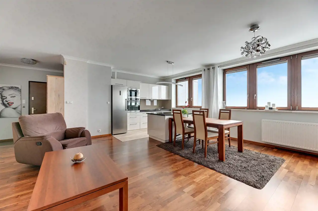 A three-room flat in the Sea Towers building with views of the sea and the city skyline. The flat was designed by an architect with attention to detail. The flat is comfortable, luxurious and at the same time functional. The flat consists of a living room with a kitchenette, two bedrooms, two bathrooms, a utility room and a hallway. The living room has a sofa set with a corner sofa and armchairs, a separate dining area with a table and 6 chairs. The kitchen annex in white buildings, with an island, has been equipped with all necessary household appliances. The smaller bedroom/office has been furnished with a wardrobe wardrobe, a bed, a desk and a chair. From the larger bedroom with a large bed and dressing table, you can directly access one of the bathrooms with a large shower cubicle. In addition to the classic fittings, there is also a bidet. The second bathroom has a bathtub. A space in the garage hall belongs to the flat.