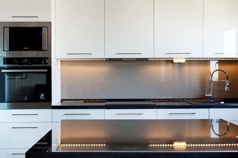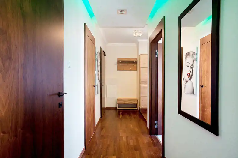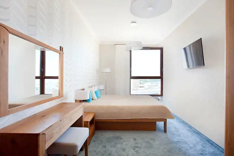 Aneks kuchenny w białej zabudowie, z wyspą, wyposażony został we wszystkie potrzebne sprzęty AGD. Mniejsza z sypialni/gabinet wyposażona została w szafę garderobianą, łóżko, biurko oraz krzesło. Z większej sypialni z dużym łożem oraz toaletką można bezpośrednio przejść do jednej z łazienek z dużą kabiną prysznicową. W wyposażeniu poza klasyczną armaturą znajduje się także bidet. W drugiej łazience znajduje się wanna. Do apartamentu przynależy miejsce w hali garażowej.