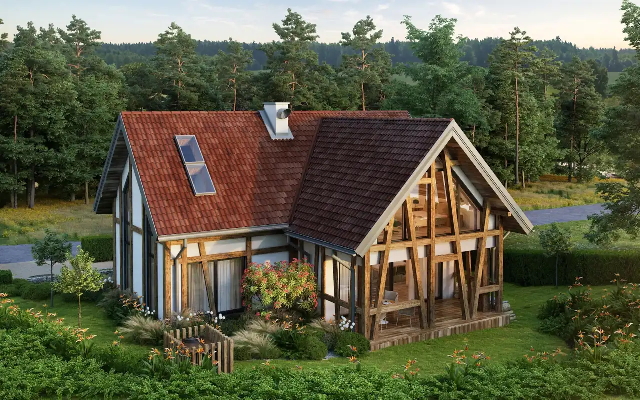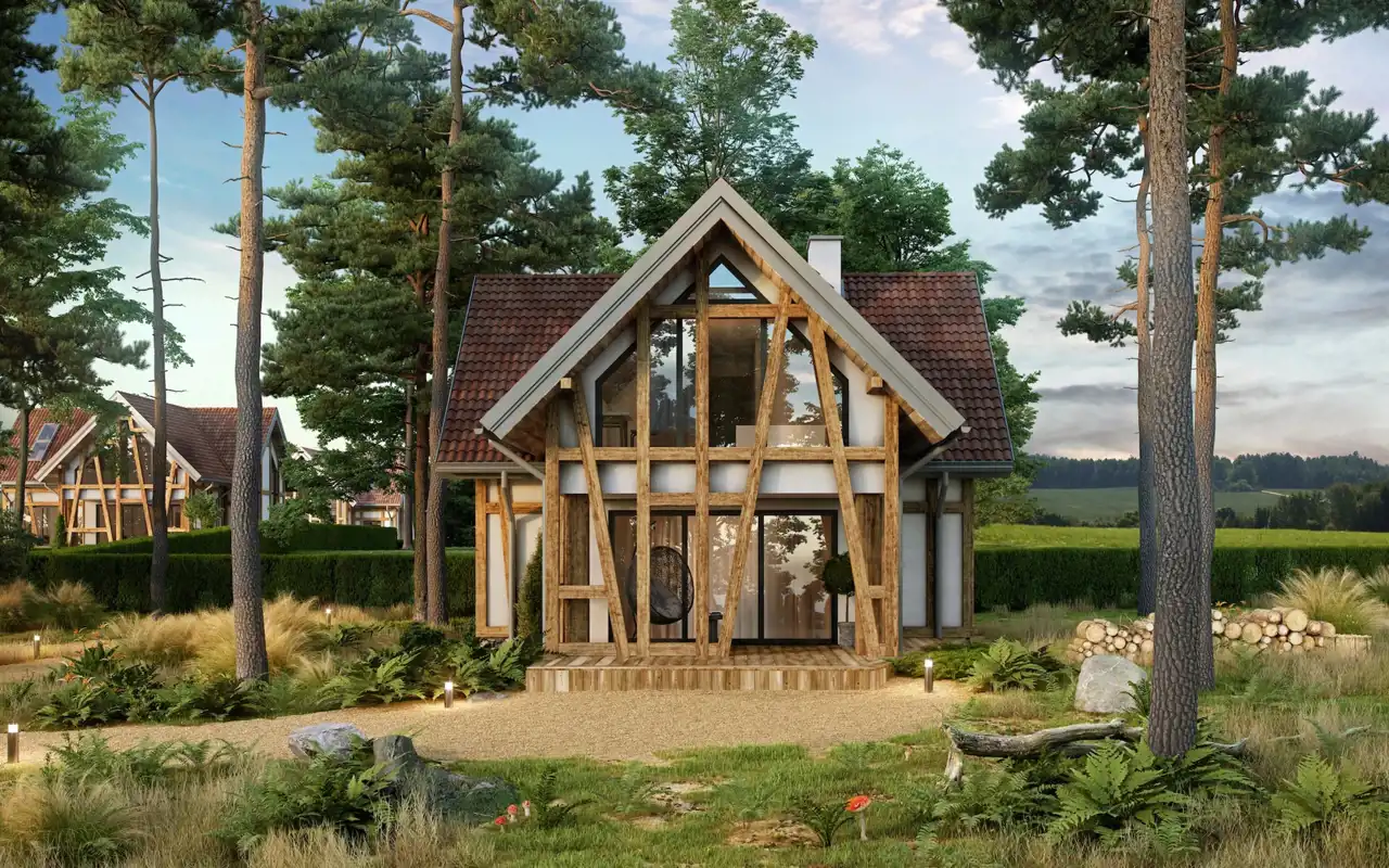 Każdy dom ma parter oraz użytkowe poddasze w drewnianej konstrukcji szkieletowej, nawiązującej do dawnych metod budowy regionu. Elewacje utrzymane są w stylu muru pruskiego, który podkreśla lokalny charakter, a zarazem nadaje całości elegancki, nowoczesny ton.