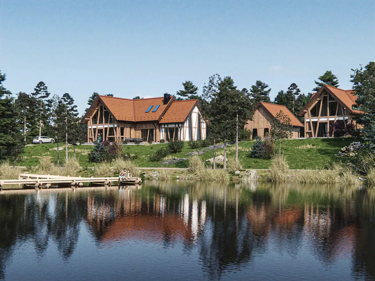Na terenie osiedla mieszkańcy mają do dyspozycji wspólny pomost nad stawem, gdzie można zrelaksować się przy wodzie, obserwować naturę lub po prostu zatrzymać się na chwilę spokoju.