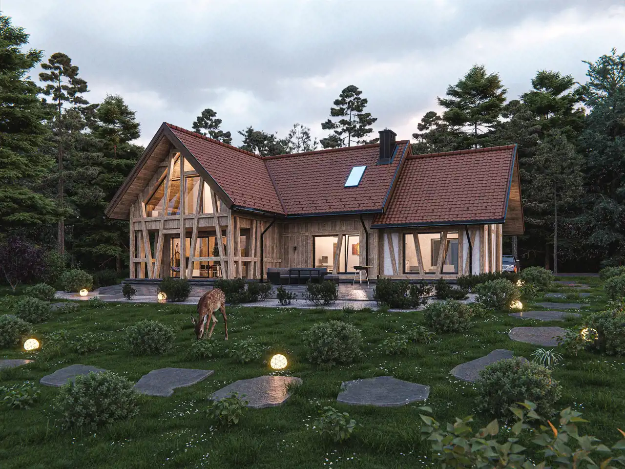 Każdy dom ma parter oraz użytkowe poddasze w drewnianej konstrukcji szkieletowej, nawiązującej do dawnych metod budowy regionu. Elewacje utrzymane są w stylu muru pruskiego, który podkreśla lokalny charakter, a zarazem nadaje całości elegancki, nowoczesny ton.