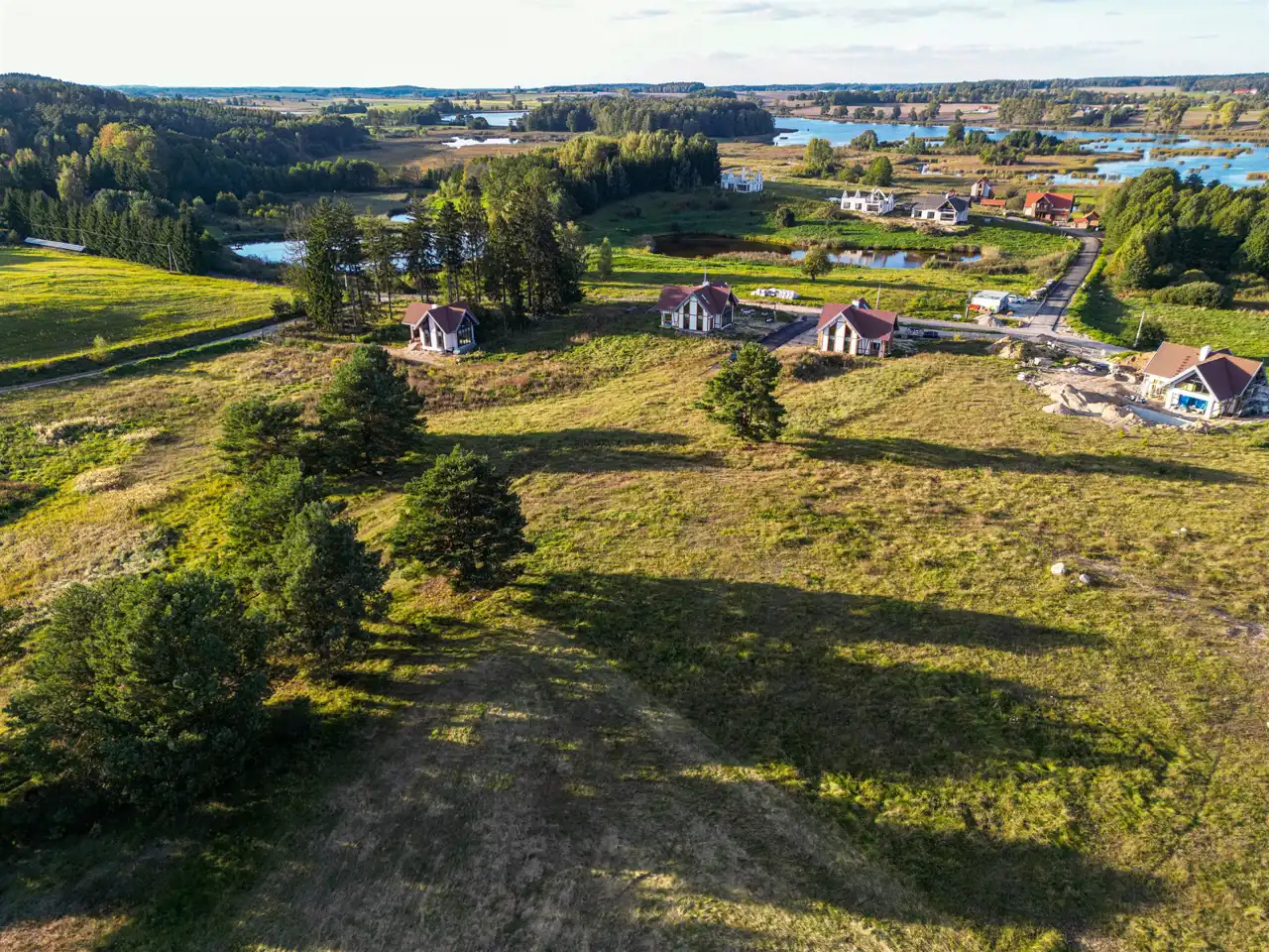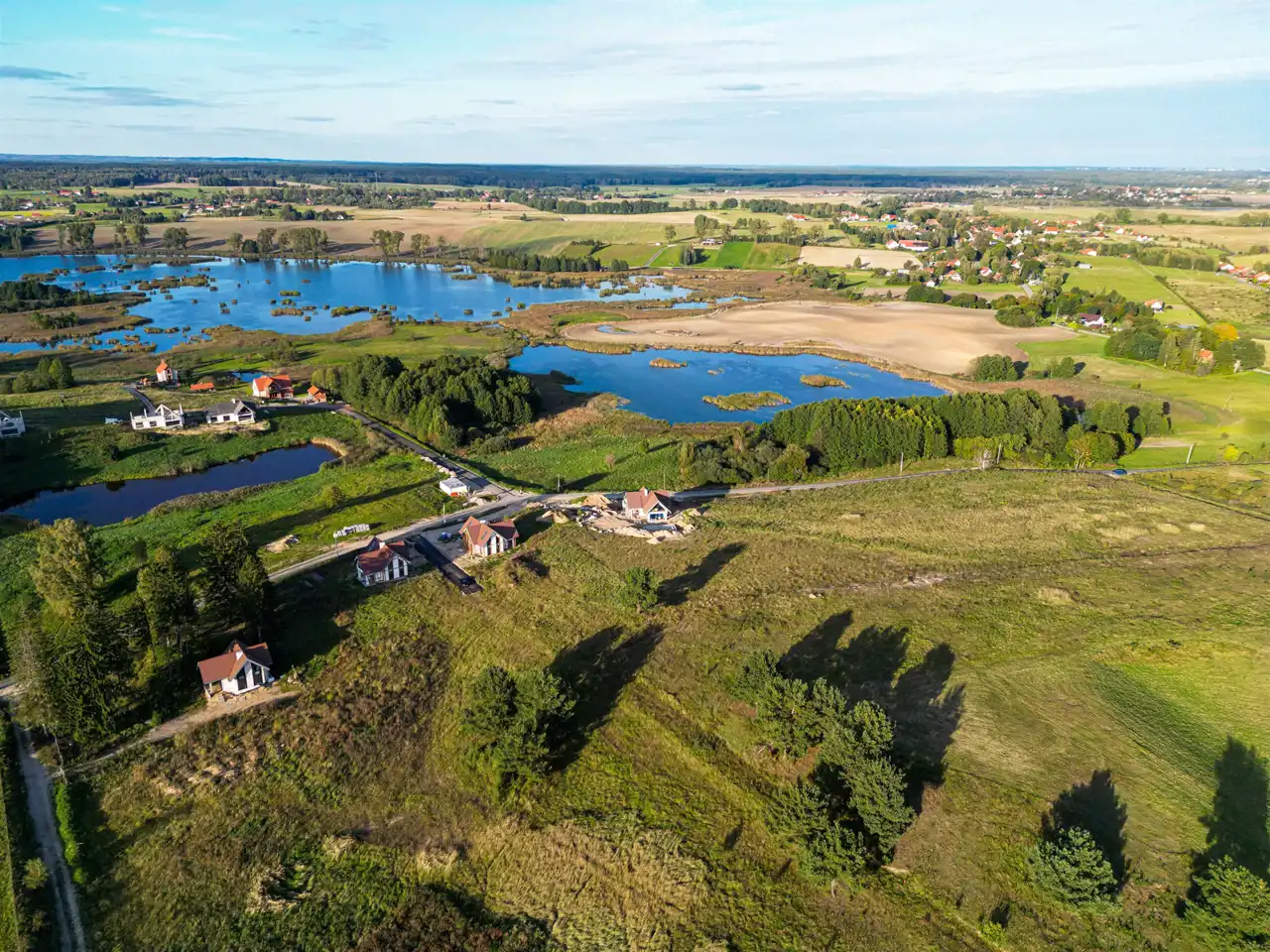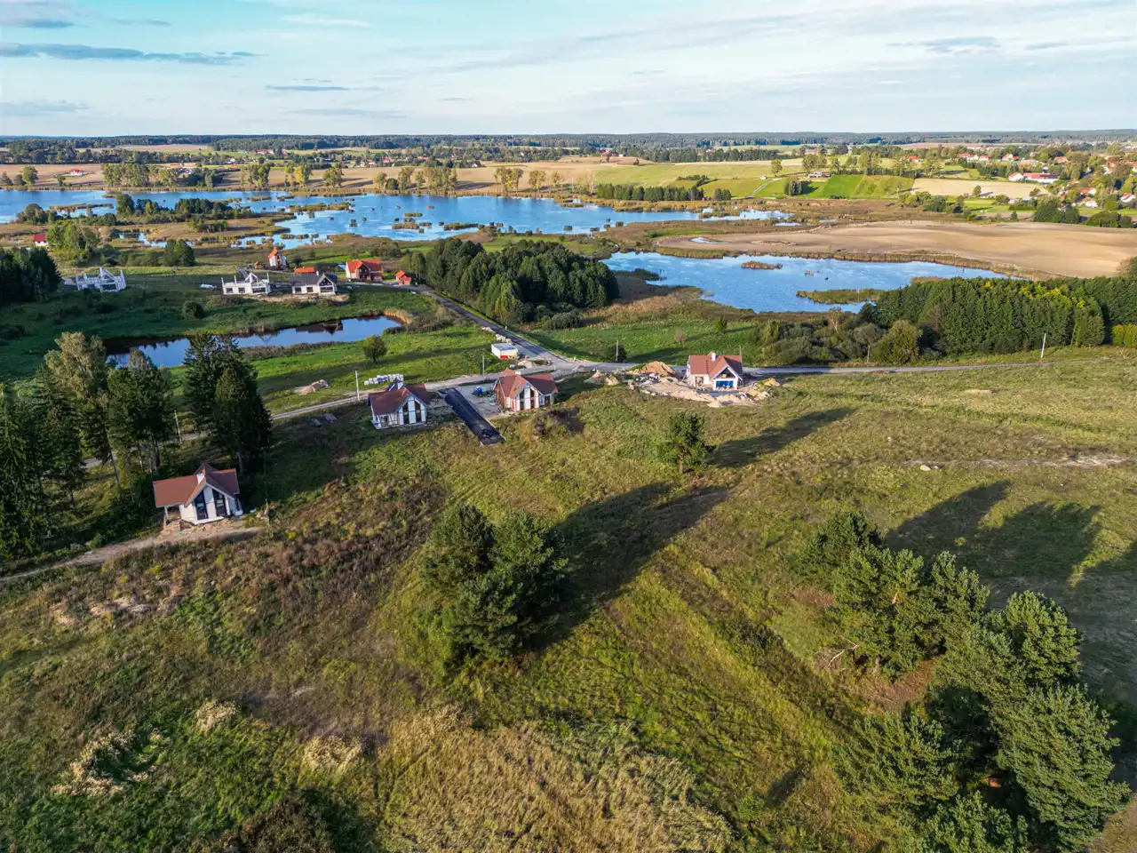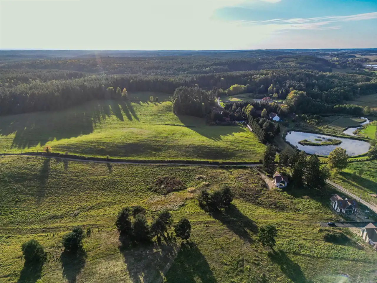 Z działek rozpościera się szeroka panorama na całą okolicę – sielski krajobraz Warmii w najlepszym wydaniu.