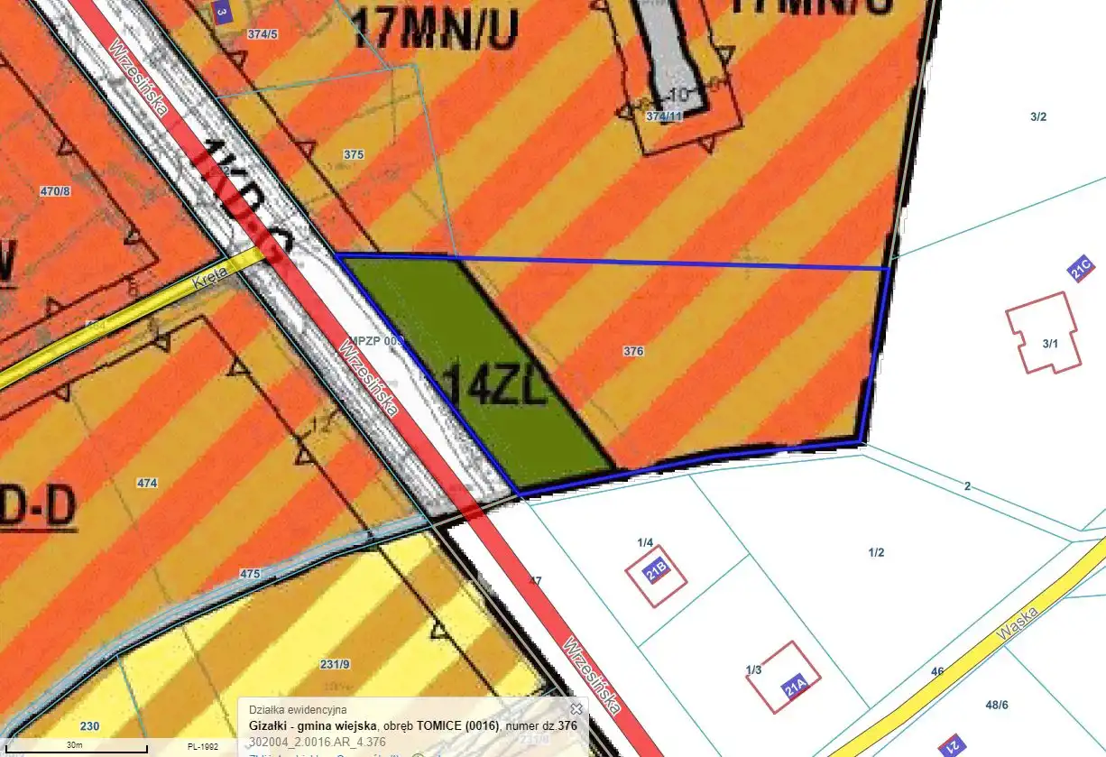 Teren budowlany działki oddziela od drogi pas zieleni leśnej oznaczony w MPZP jako 14 ZL. Dzięki temu została stworzona naturalna bariera ochronna, zapewniająca więcej spokoju, prywatności i ciszy.