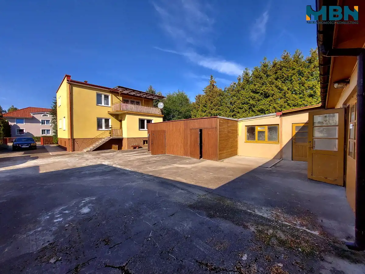 Dom z budynkami po byłej stolarni na ładnie zagospodarowanej działce.