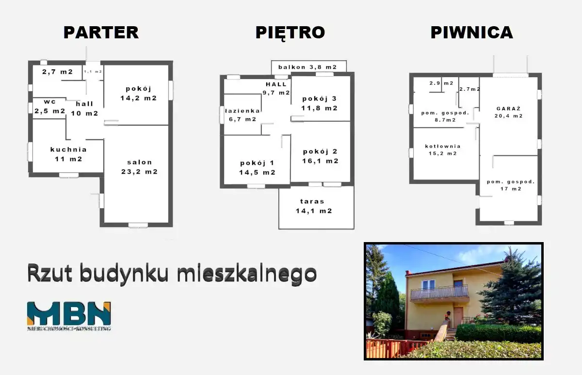 W części piwnicznej znajdują się 3 pomieszczenia gospodarcze (w tym kotłownia), spiżarka i garaż;