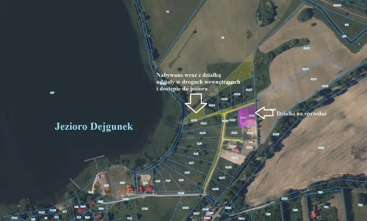 Do każdej działki nabywamy udział w działkach o numerach geod. 41/12 (dojście do jeziora), o nr geod. 41/13 i 41/30 (drogi wewnętrzne)