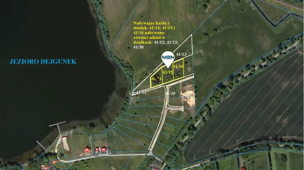 - Do każdej działki nabywamy udział w działkach o numerach geod. 41/12 (dojście do jeziora), o nr geod. 41/13 i 41/30 (drogi wewnętrzne)