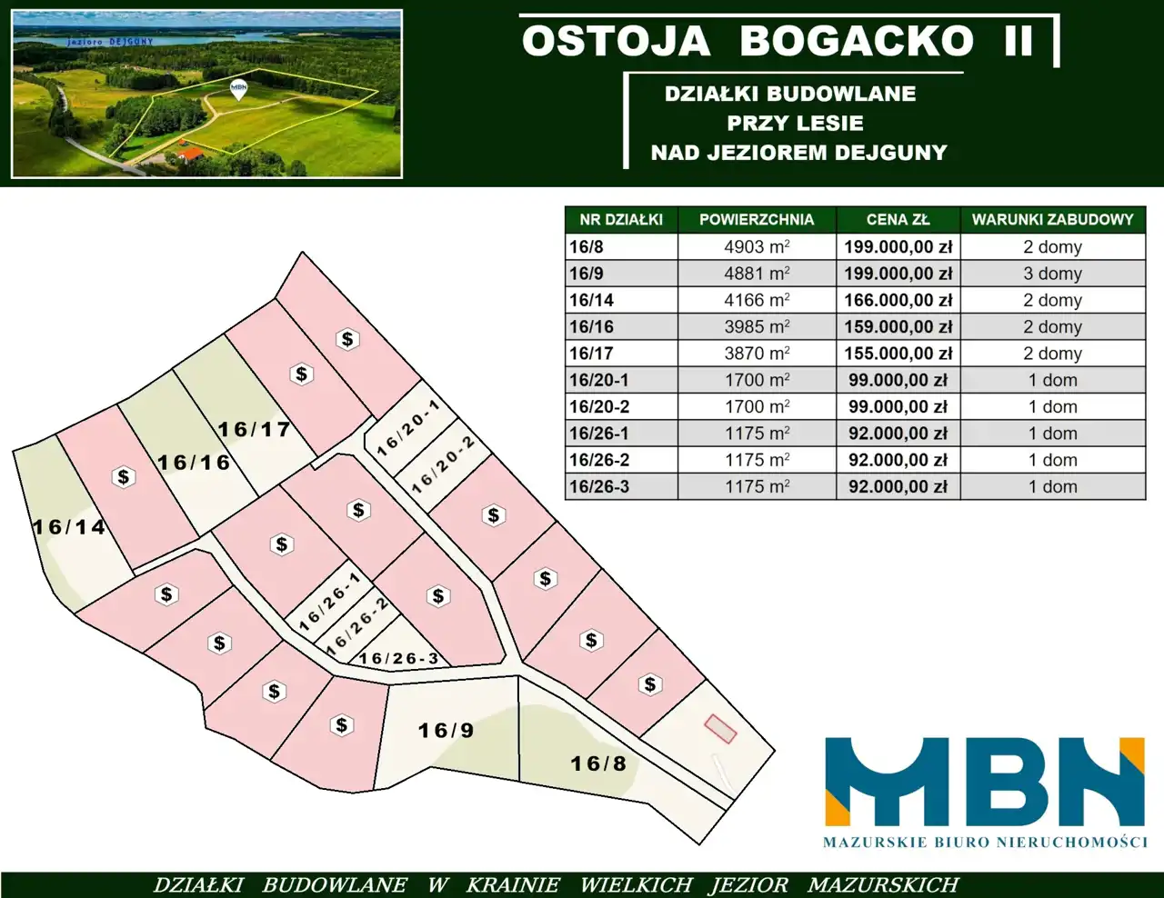 Oferta obejmuje teren blisko 8 hektarów i składa się z 21 działek o powierzchni ponad 3000 m2 każda. Kształt części działek pozwala na ewentualny ich podział wtórny i uzyskanie z jednej działki dwóch budowlanych.