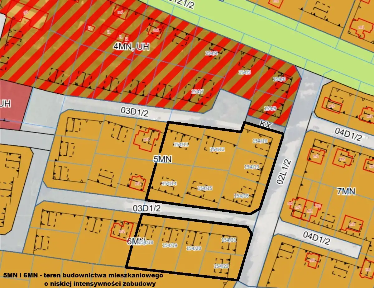 Działki objęte są symbolem 5MN i 6 MN - tereny budownictwa mieszkaniowego o niskiej intensywności zabudowy.