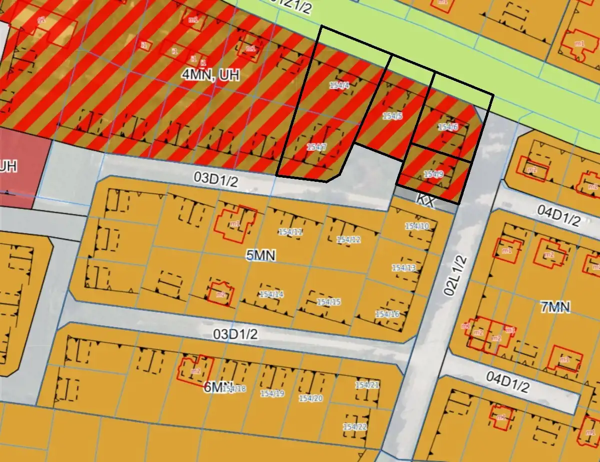 Działki objęte są symbolem 4MN, UH - tereny budownictwa mieszkaniowego o niskiej intensywności zabudowy, tereny usług i handlu.