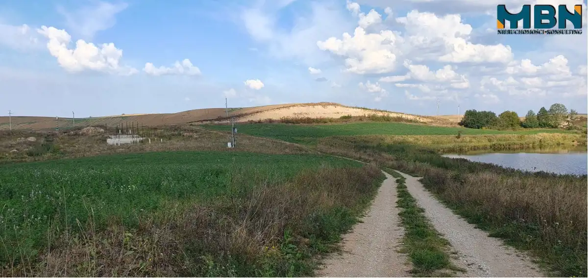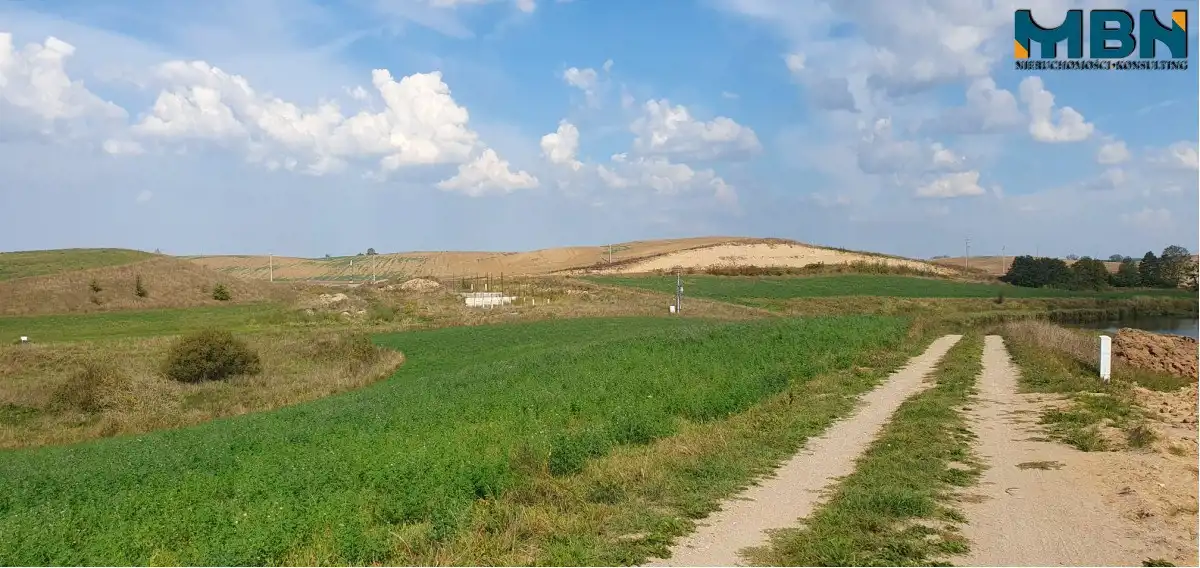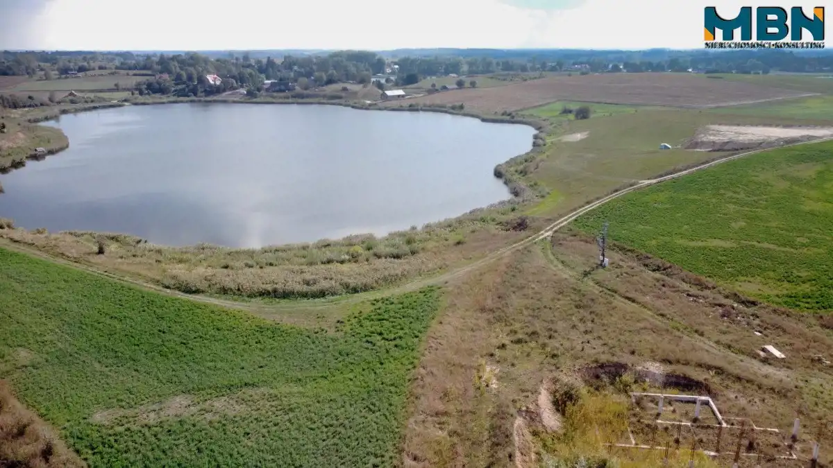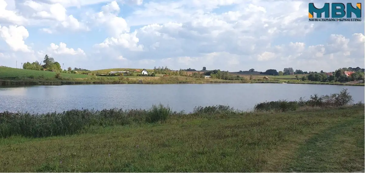 Działka położona na wzgórzu z widokiem na jezioro. Okolica bardzo malownicza, pagórkowata i spokojna.