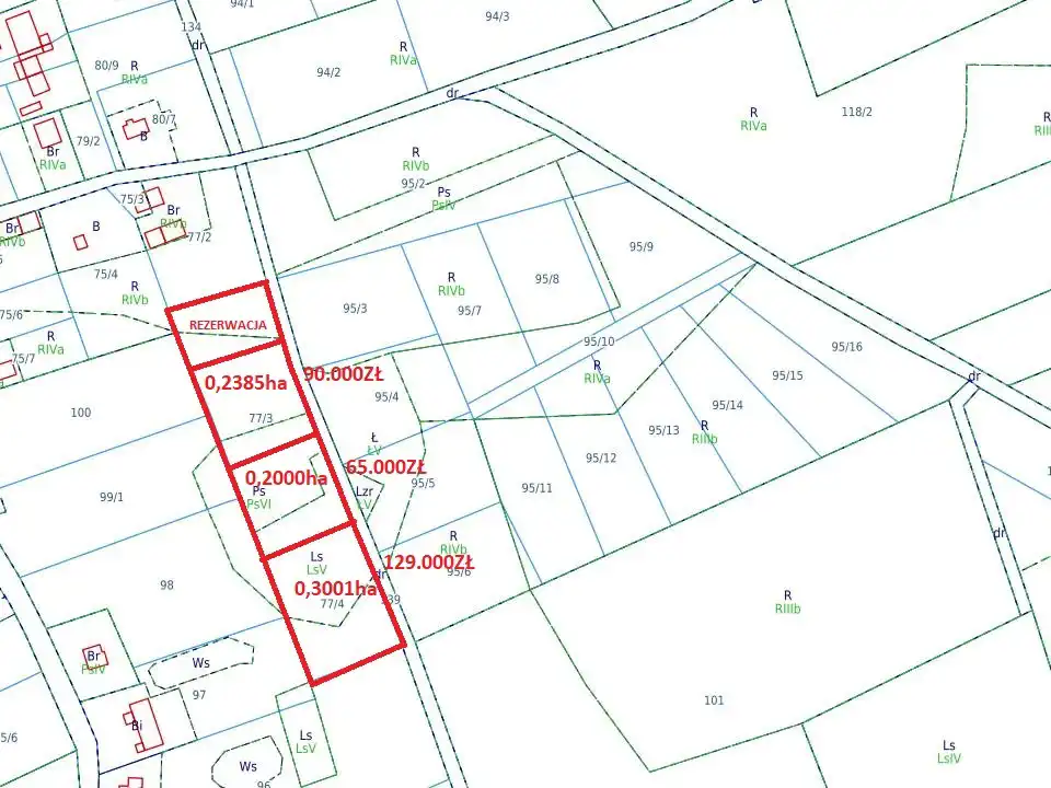 - działka o pow. 0.2385ha za cenę 90.000zł