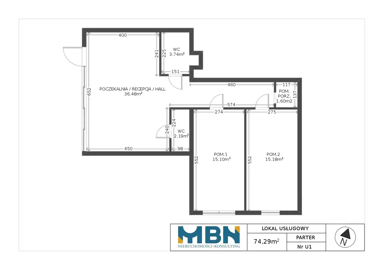 Lokal niemieszkalny o łącznej powierzchni użytkowej 74,29m2;