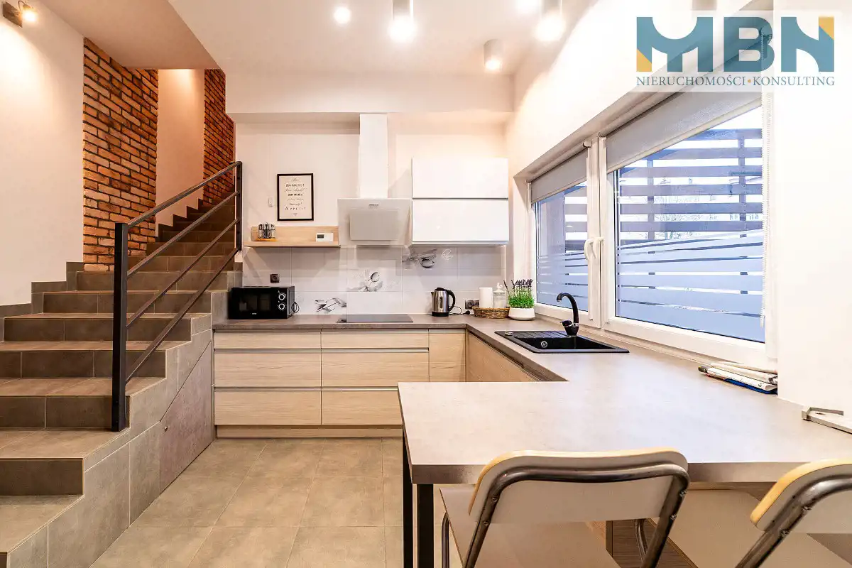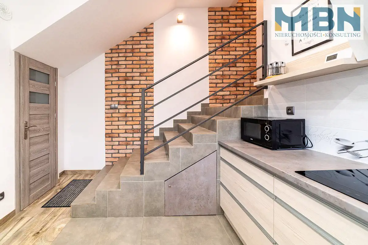 w mieszkaniu: aneks kuchenny na parterze ze schodami na pierwsze piętro, gdzie znajdziemy 2 pokoje oraz łazienkę,