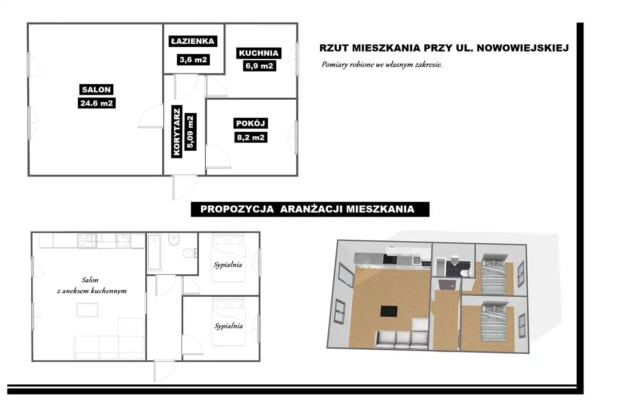 Ilość pomieszczeń: salon, sypialnia, przedpokój, kuchnia i łazienka z wc;