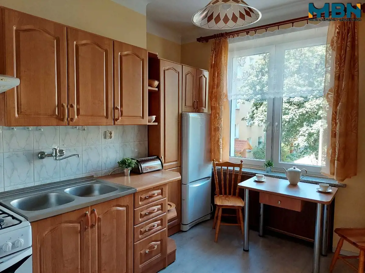 Kuchnia o pow. ok. 8,23 m2 z oknem na podwórek, wyposażona w kuchenkę gazową wolnostojącą, zlew, lodówkę i meble kuchenne;