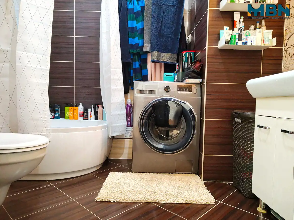 - Łazienka: pow. ok 4,70m2, umywalka osadzona na szafce, WC podwieszany, grzejnik typu suszarka, głęboki brodzik z siedziskiem, pralka Samsung;