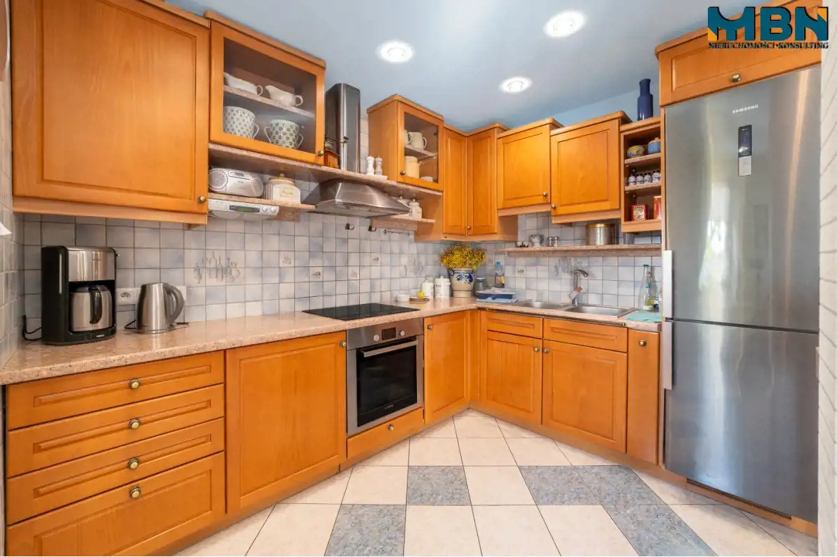 Kuchnia otwarta o pow. ok. 8m2, połączona z salonem o pow. ok. 16m2 i jadalnią o pow. ok. 11,5m2 (umeblowana zabudową na wymiar oraz wyposażona w sprzęt AGD – ceramiczną płytę indukcyjną, piekarnik elektryczny, okap pod kominowy, lodówkę z zamrażarką, zlewozmywak), z jadalni wyjście na balkon;