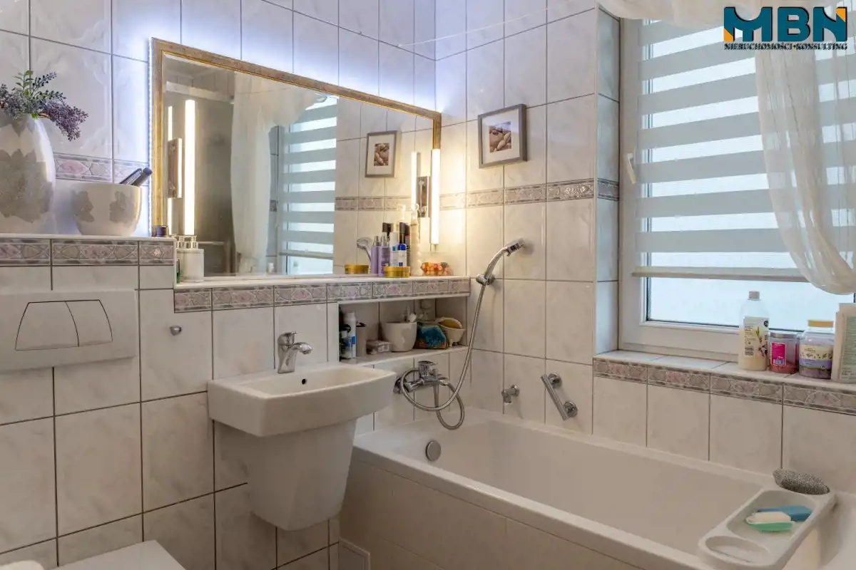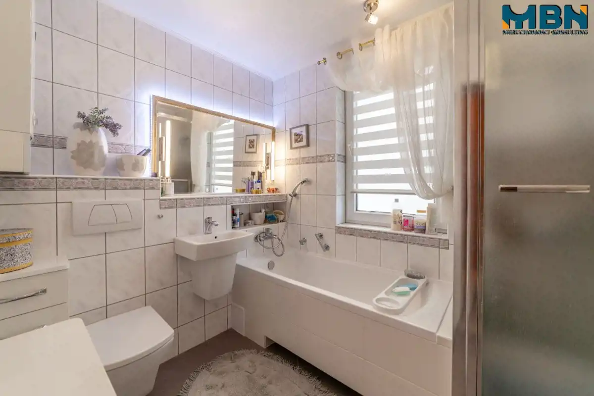 Łazienka z oknem o pow. ok. 6m2 wyposażona w wannę, prysznic, umywalkę i WC kompakt ceramiczny;