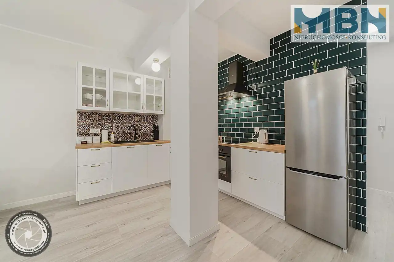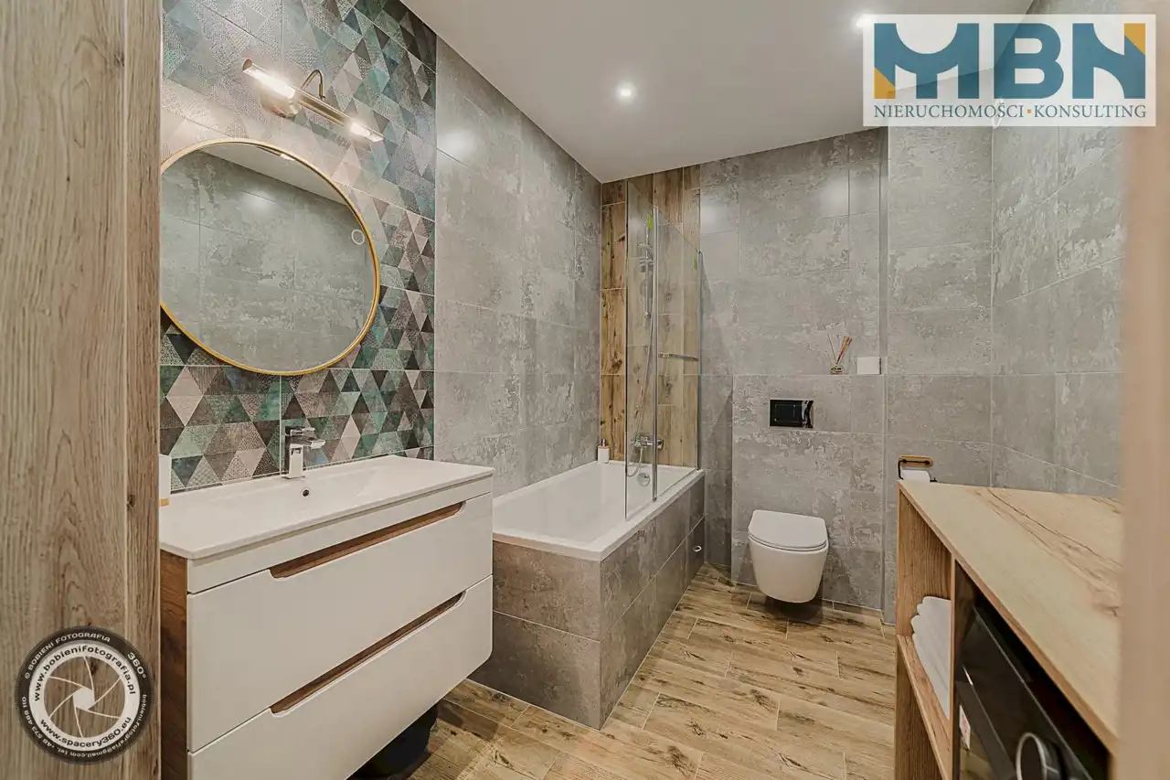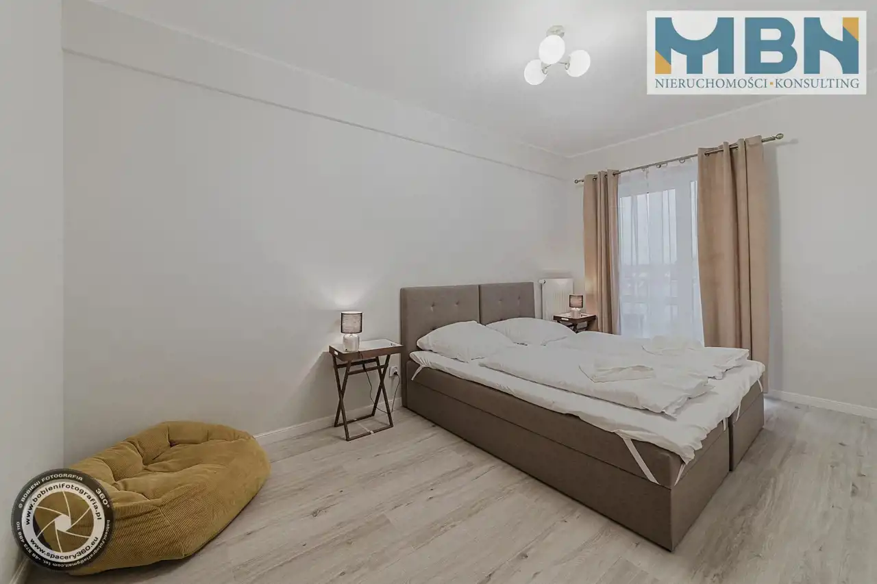 Ilość pokoi: sypialnia z osobnym pomieszczeniem (garderobą), salon z aneksem kuchennym, łazienka z wanną i WC;