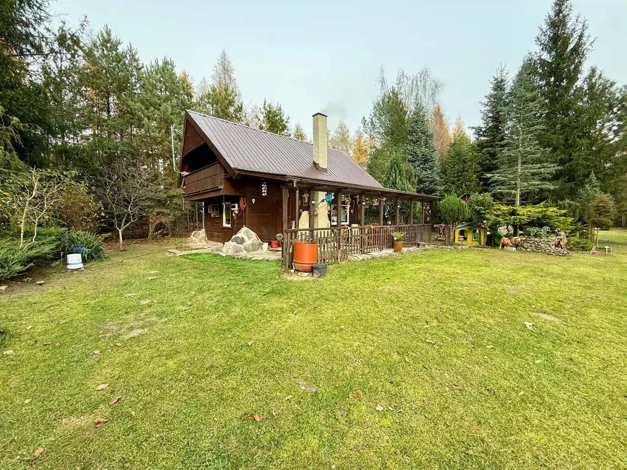 Przytulny domek letniskowy o funkcjonalnym układzie, wyposażony w duży taras idealny do wypoczynku oraz dwa balkony na piętrze, z których rozpościera się widok na zadrzewioną część działki.