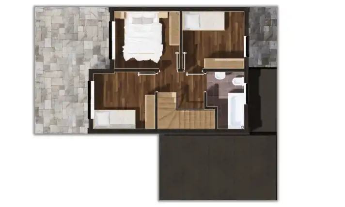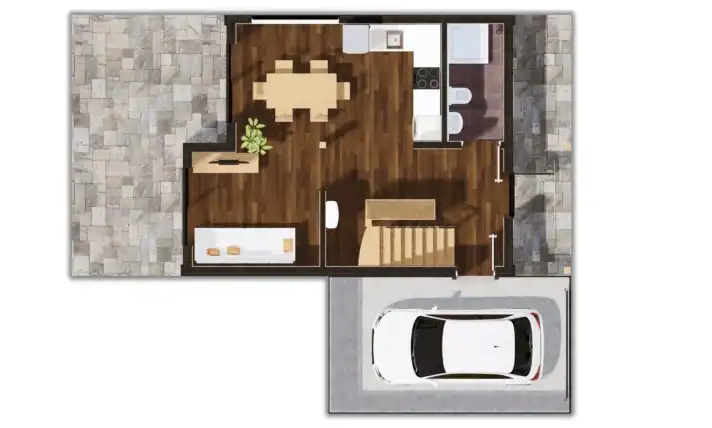 Powierzchnia domu: parter 60 m², antresola 30 m², garaż 17 m².