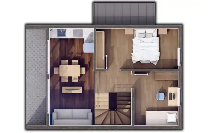 Centralnym elementem domu jest antresola, która dodaje wnętrzu wyjątkowej lekkości i nowoczesnego charakteru. Otwarta przestrzeń nad salonem nie tylko wizualnie powiększa dom, ale także umożliwia ciekawe aranżacje.