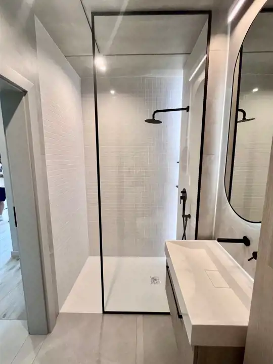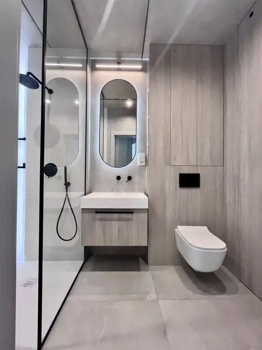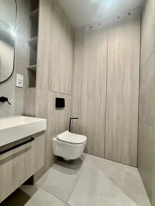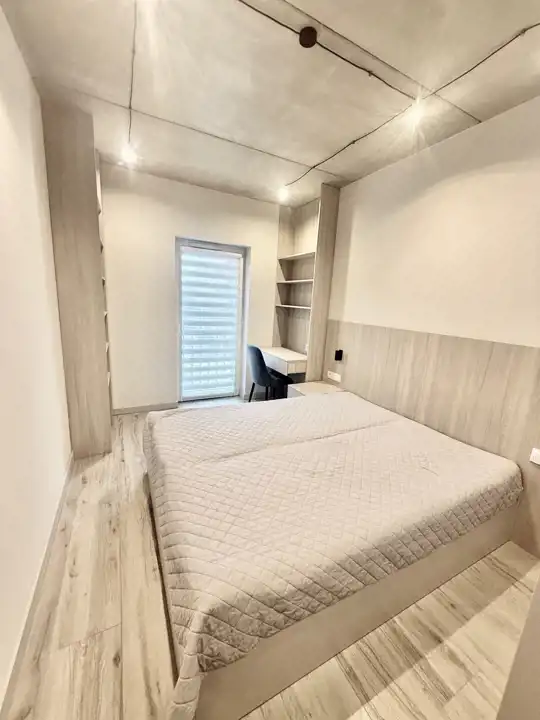 Całość utrzymana w jasnych odcieniach szarości. Sufity beton. Na podłodze kafle stylizowane na bieloną deskę. Nowoczesne oświetlenie. Łazienka wspólna z wc w nowoczesnych płytkach wyposażona w kabinę prysznicową.