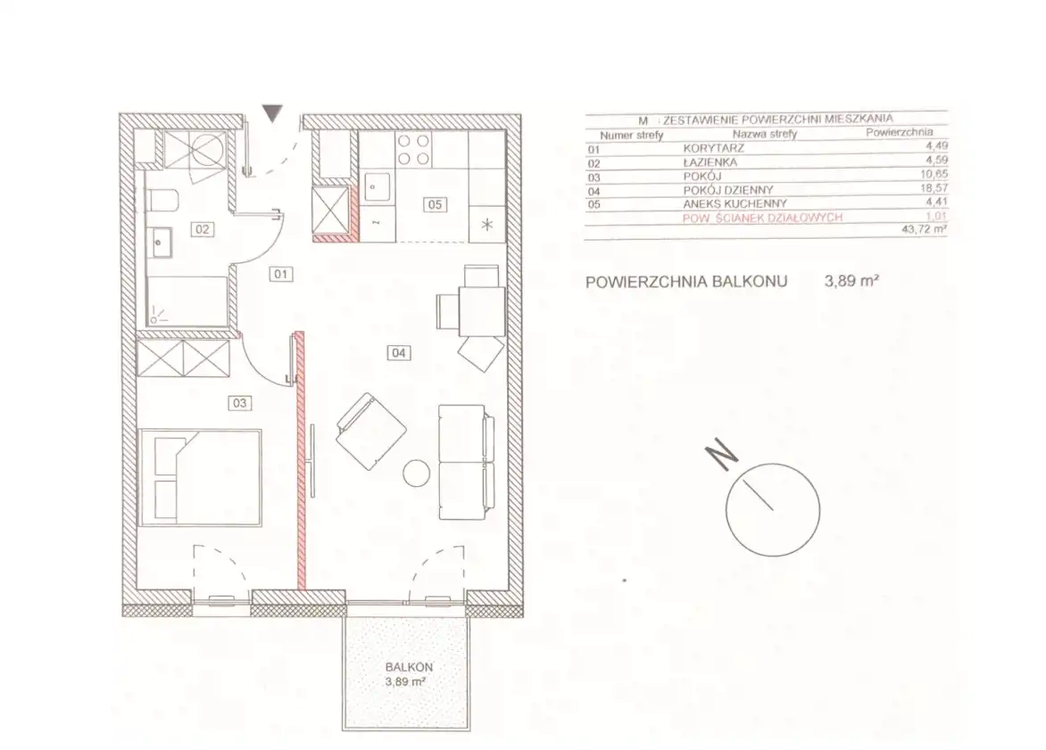 - Charakterystyka mieszkania 43.72 m2, 2 pokoje