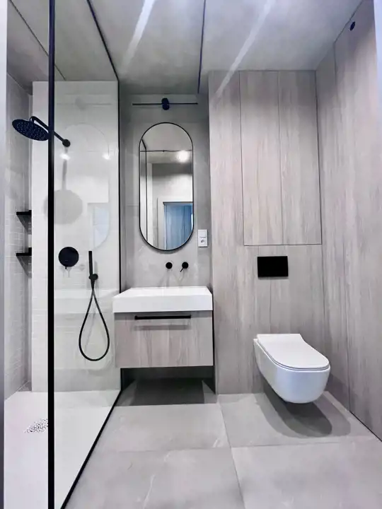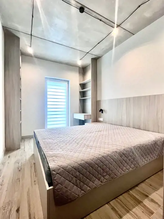 Całość utrzymana w jasnych odcieniach szarości. Sufity beton. Na podłodze kafle stylizowane na bieloną deskę. Nowoczesne oświetlenie. Łazienka wspólna z wc w nowoczesnych płytkach wyposażona w kabinę prysznicową.