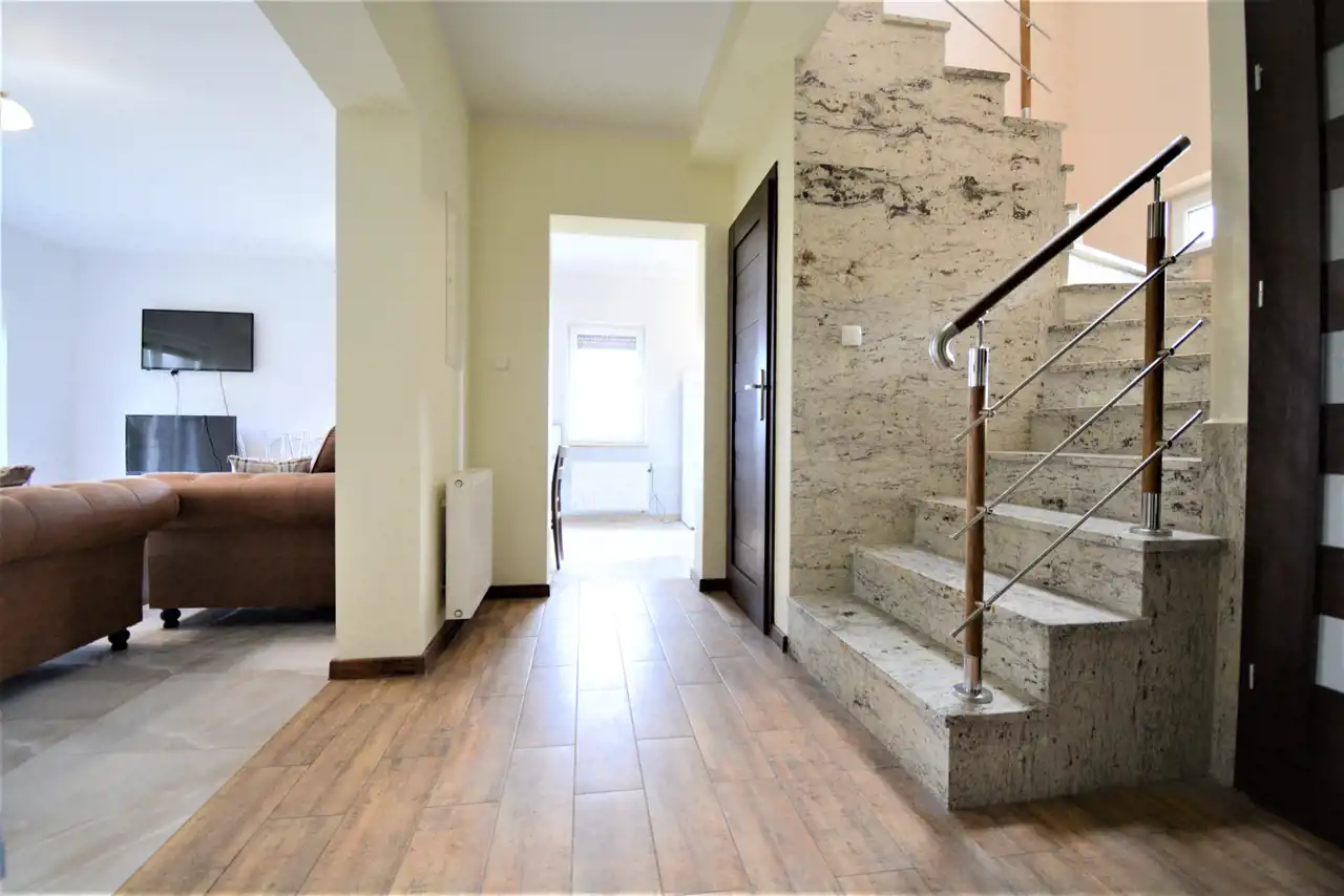 Dom zadbany, ocieplony, okna PCV z roletami zewnętrznymi, podłogi płytki i panele, ściany gładzie, drzwi wejściowe antywłamaniowe, schody i parapety granitowe